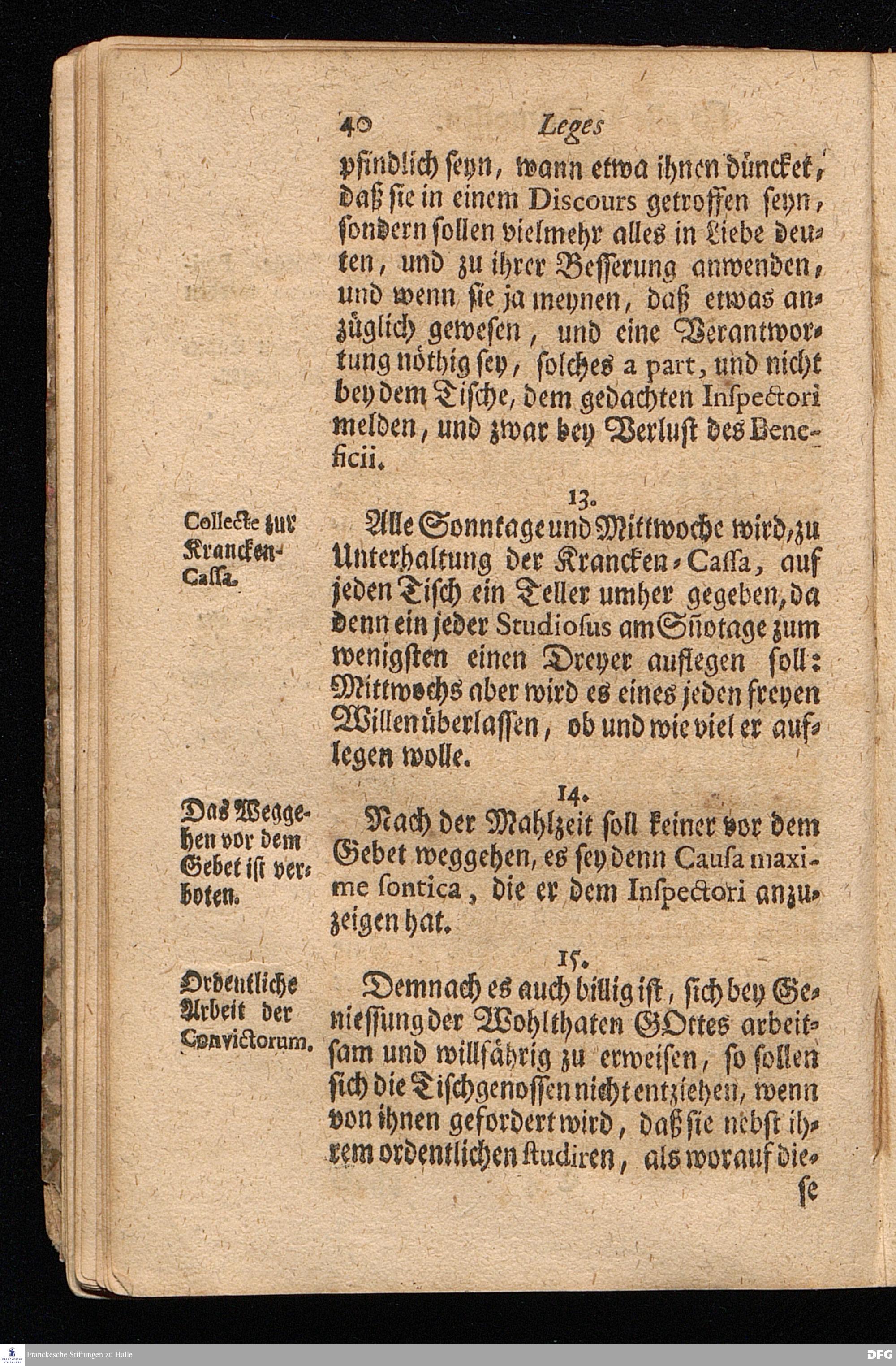 Der von GOTT in dem Wäysenhause zu Glaucha an Halle (für ietzo auf 500. Personen) Zubereitete Tisch / Nach seinem Anfang / Fortgang / gegenwärtigem Zustand und eingeführter Tisch=Ordnung kürtzlich beschrieben, mit angehängten 2. Erweckungs Reden / Deren die erste Anno 1699. [vielmehr 1700!] bey Einweihung des damaligen kleinern Speise=Saals, Die andere Anno 1711. bey Einweihung des grossen Saals gehalten worden, von August Hermann Francken / S.Theol.Prof.& Past.zu S.Ulrich / und des Gymnasii Scholarcha, h.t. Acad.Pro-Rectore. HALLE, In Verlegung des Wäysenhauses, MDCCXVII.
