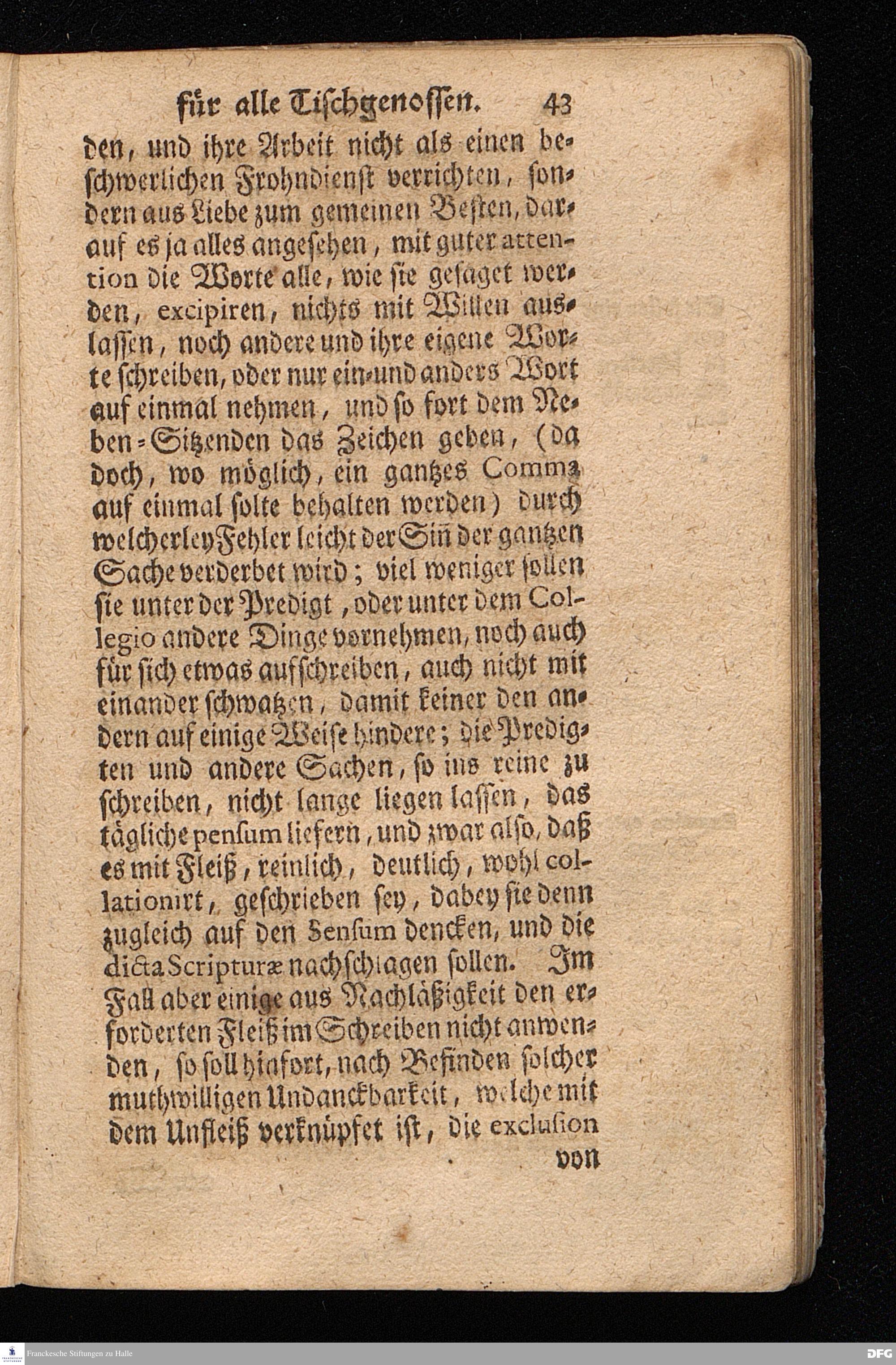 Der von GOTT in dem Wäysenhause zu Glaucha an Halle (für ietzo auf 500. Personen) Zubereitete Tisch / Nach seinem Anfang / Fortgang / gegenwärtigem Zustand und eingeführter Tisch=Ordnung kürtzlich beschrieben, mit angehängten 2. Erweckungs Reden / Deren die erste Anno 1699. [vielmehr 1700!] bey Einweihung des damaligen kleinern Speise=Saals, Die andere Anno 1711. bey Einweihung des grossen Saals gehalten worden, von August Hermann Francken / S.Theol.Prof.& Past.zu S.Ulrich / und des Gymnasii Scholarcha, h.t. Acad.Pro-Rectore. HALLE, In Verlegung des Wäysenhauses, MDCCXVII.