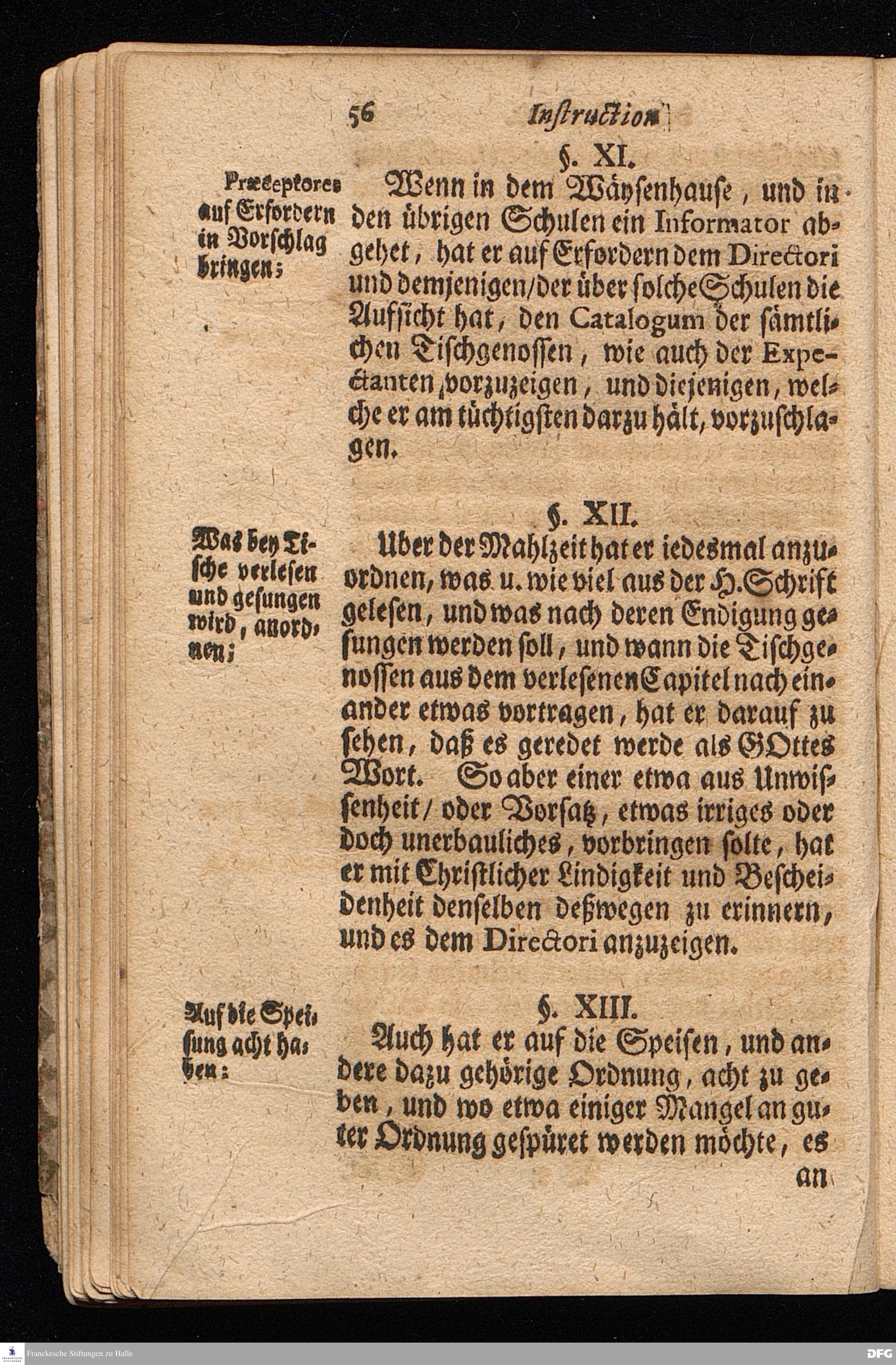 Der von GOTT in dem Wäysenhause zu Glaucha an Halle (für ietzo auf 500. Personen) Zubereitete Tisch / Nach seinem Anfang / Fortgang / gegenwärtigem Zustand und eingeführter Tisch=Ordnung kürtzlich beschrieben, mit angehängten 2. Erweckungs Reden / Deren die erste Anno 1699. [vielmehr 1700!] bey Einweihung des damaligen kleinern Speise=Saals, Die andere Anno 1711. bey Einweihung des grossen Saals gehalten worden, von August Hermann Francken / S.Theol.Prof.& Past.zu S.Ulrich / und des Gymnasii Scholarcha, h.t. Acad.Pro-Rectore. HALLE, In Verlegung des Wäysenhauses, MDCCXVII.