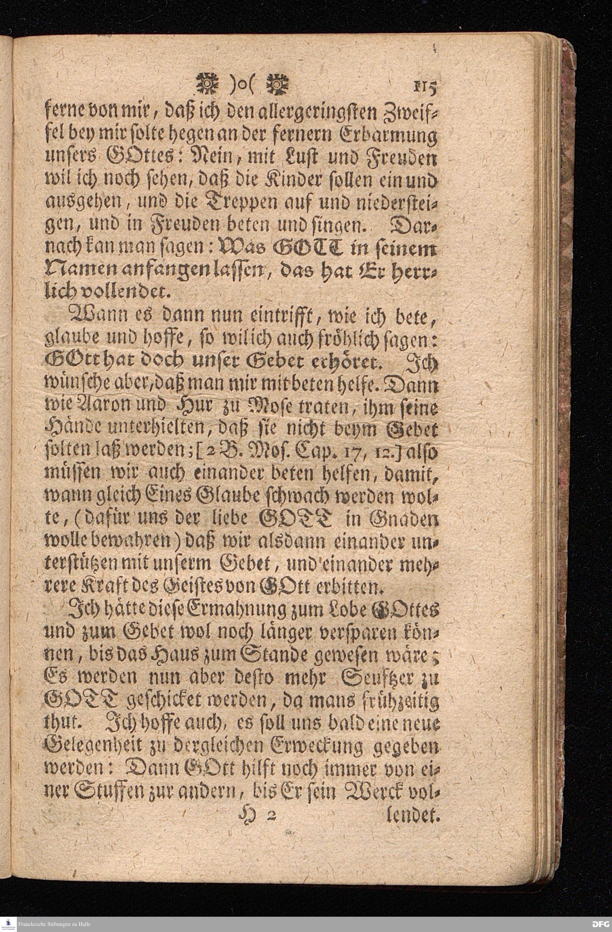 Der von GOTT in dem Wäysenhause zu Glaucha an Halle (für ietzo auf 500. Personen) Zubereitete Tisch / Nach seinem Anfang / Fortgang / gegenwärtigem Zustand und eingeführter Tisch=Ordnung kürtzlich beschrieben, mit angehängten 2. Erweckungs Reden / Deren die erste Anno 1699. [vielmehr 1700!] bey Einweihung des damaligen kleinern Speise=Saals, Die andere Anno 1711. bey Einweihung des grossen Saals gehalten worden, von August Hermann Francken / S.Theol.Prof.& Past.zu S.Ulrich / und des Gymnasii Scholarcha, h.t. Acad.Pro-Rectore. HALLE, In Verlegung des Wäysenhauses, MDCCXVII.
