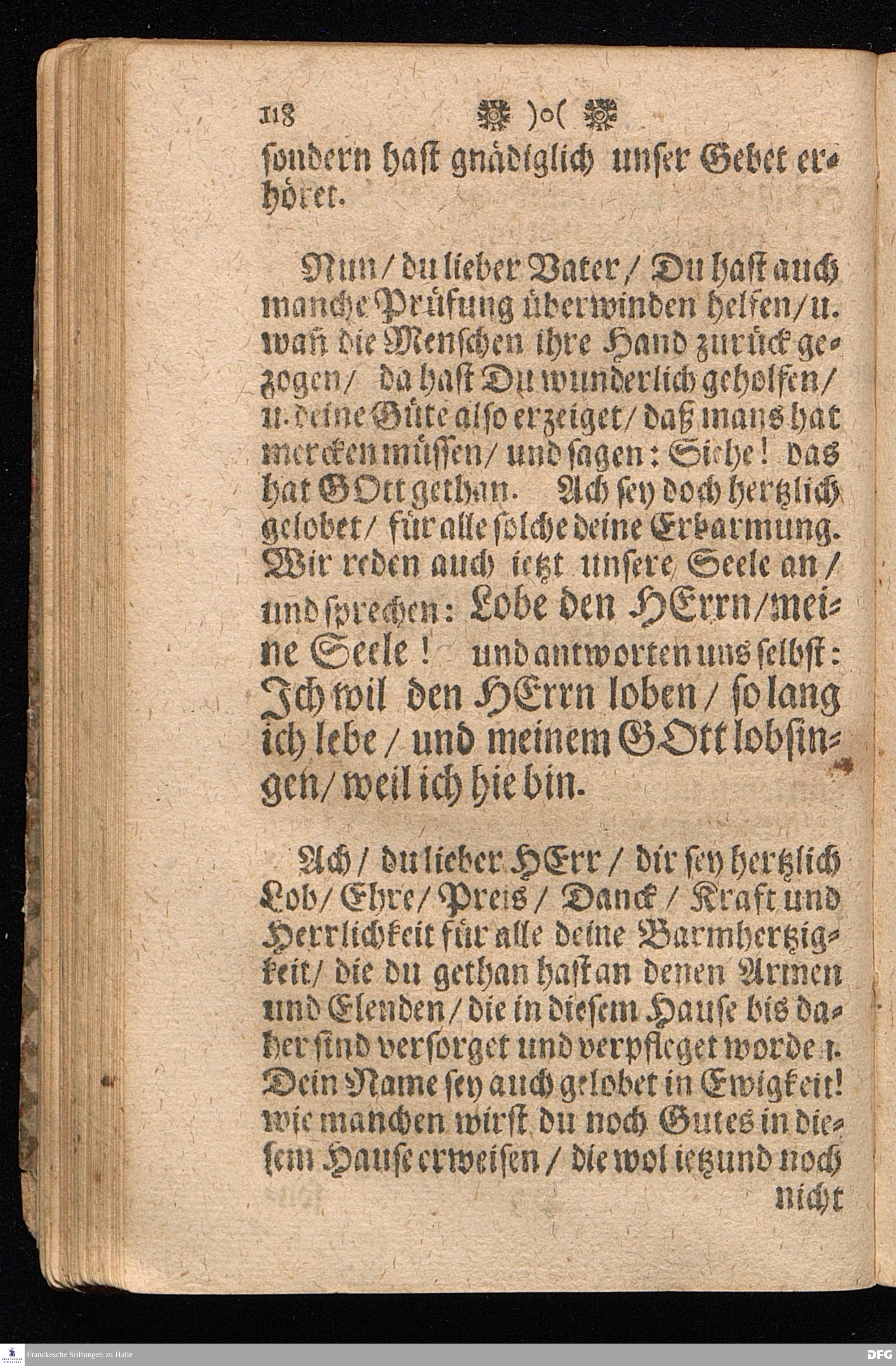 Der von GOTT in dem Wäysenhause zu Glaucha an Halle (für ietzo auf 500. Personen) Zubereitete Tisch / Nach seinem Anfang / Fortgang / gegenwärtigem Zustand und eingeführter Tisch=Ordnung kürtzlich beschrieben, mit angehängten 2. Erweckungs Reden / Deren die erste Anno 1699. [vielmehr 1700!] bey Einweihung des damaligen kleinern Speise=Saals, Die andere Anno 1711. bey Einweihung des grossen Saals gehalten worden, von August Hermann Francken / S.Theol.Prof.& Past.zu S.Ulrich / und des Gymnasii Scholarcha, h.t. Acad.Pro-Rectore. HALLE, In Verlegung des Wäysenhauses, MDCCXVII.