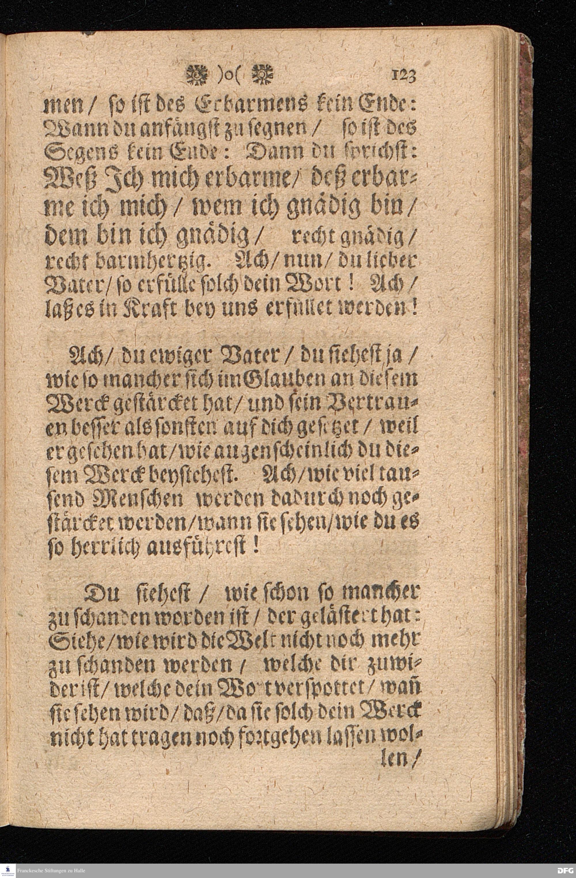 Der von GOTT in dem Wäysenhause zu Glaucha an Halle (für ietzo auf 500. Personen) Zubereitete Tisch / Nach seinem Anfang / Fortgang / gegenwärtigem Zustand und eingeführter Tisch=Ordnung kürtzlich beschrieben, mit angehängten 2. Erweckungs Reden / Deren die erste Anno 1699. [vielmehr 1700!] bey Einweihung des damaligen kleinern Speise=Saals, Die andere Anno 1711. bey Einweihung des grossen Saals gehalten worden, von August Hermann Francken / S.Theol.Prof.& Past.zu S.Ulrich / und des Gymnasii Scholarcha, h.t. Acad.Pro-Rectore. HALLE, In Verlegung des Wäysenhauses, MDCCXVII.