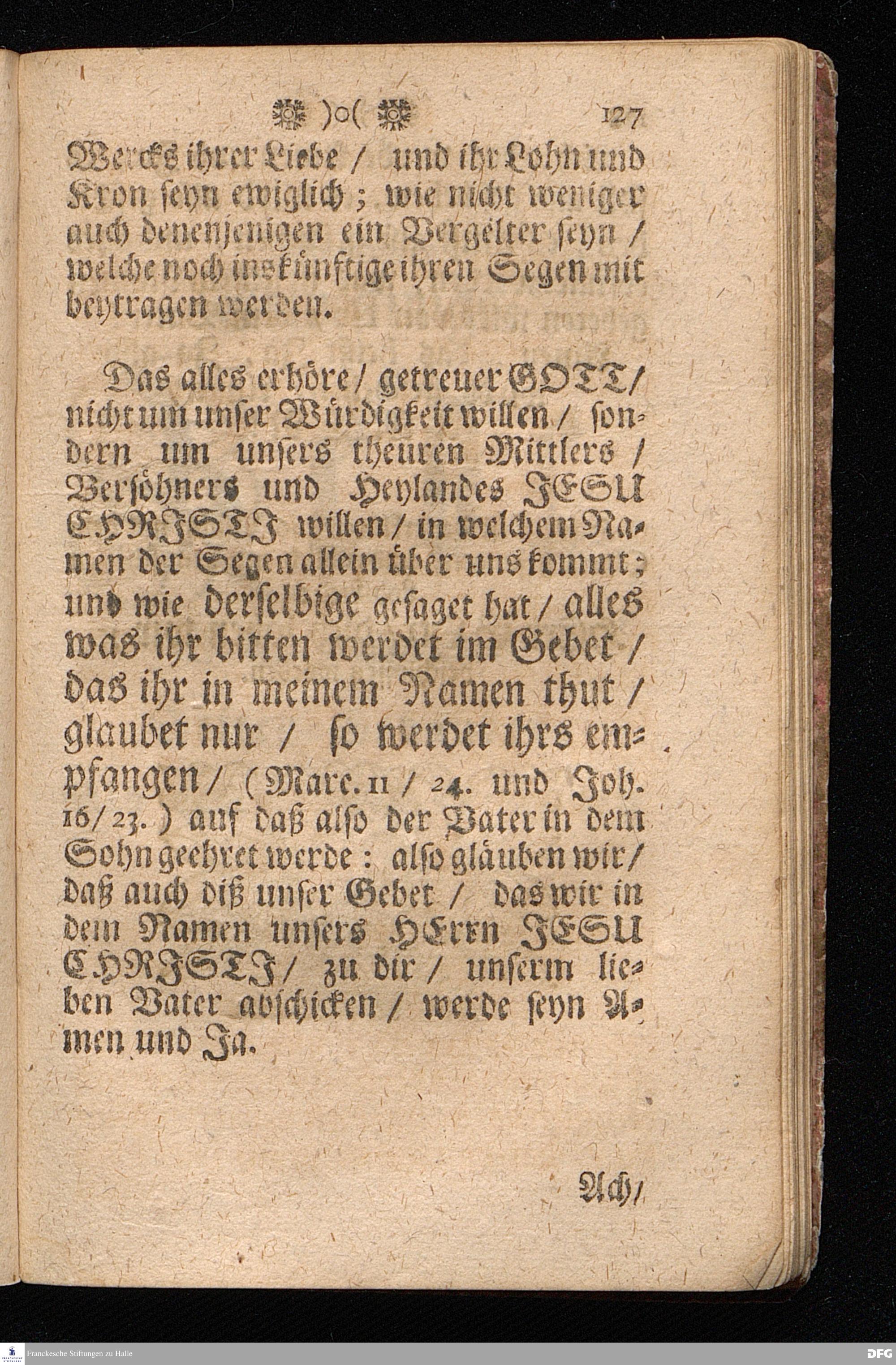 Der von GOTT in dem Wäysenhause zu Glaucha an Halle (für ietzo auf 500. Personen) Zubereitete Tisch / Nach seinem Anfang / Fortgang / gegenwärtigem Zustand und eingeführter Tisch=Ordnung kürtzlich beschrieben, mit angehängten 2. Erweckungs Reden / Deren die erste Anno 1699. [vielmehr 1700!] bey Einweihung des damaligen kleinern Speise=Saals, Die andere Anno 1711. bey Einweihung des grossen Saals gehalten worden, von August Hermann Francken / S.Theol.Prof.& Past.zu S.Ulrich / und des Gymnasii Scholarcha, h.t. Acad.Pro-Rectore. HALLE, In Verlegung des Wäysenhauses, MDCCXVII.