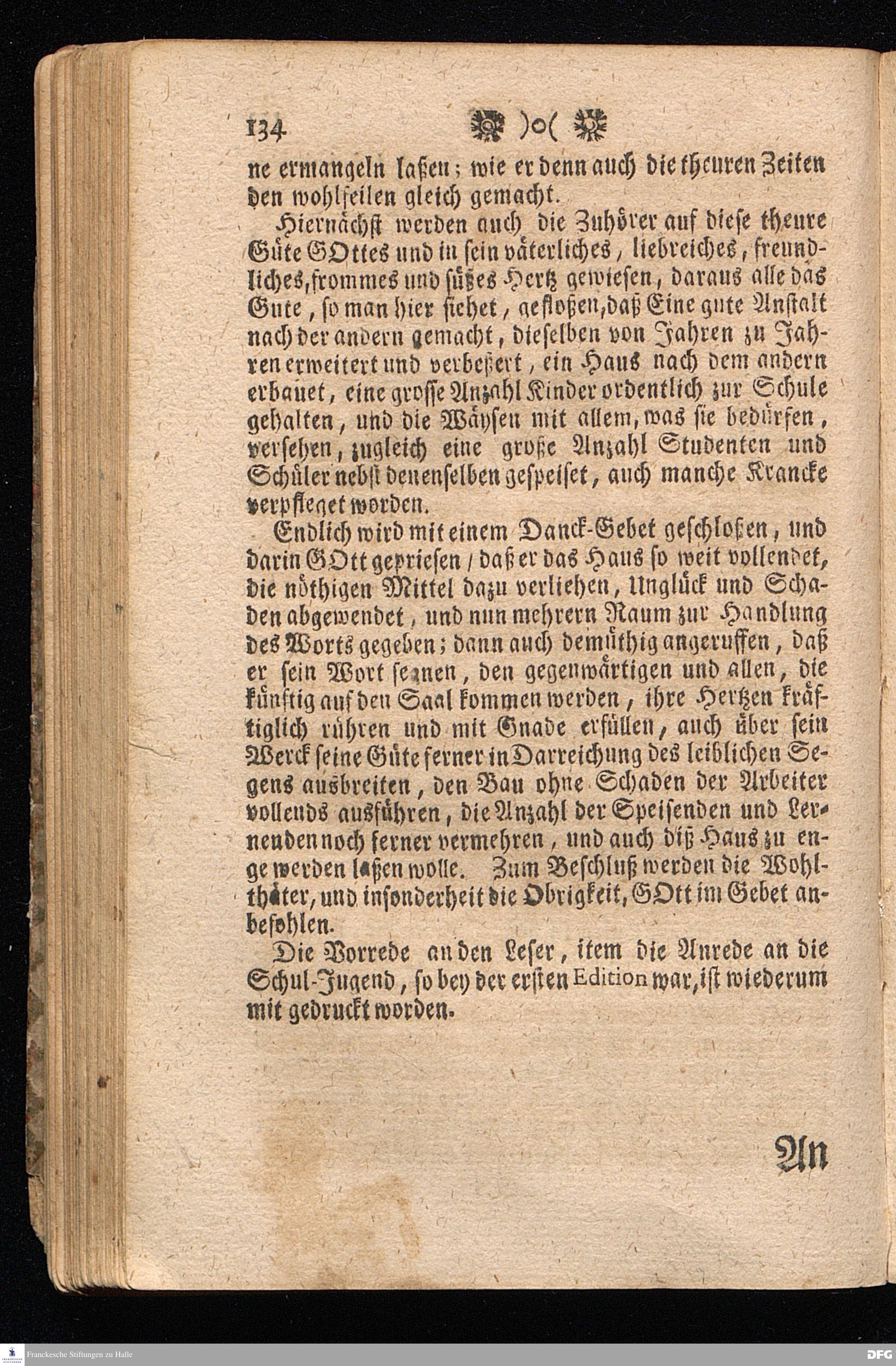Der von GOTT in dem Wäysenhause zu Glaucha an Halle (für ietzo auf 500. Personen) Zubereitete Tisch / Nach seinem Anfang / Fortgang / gegenwärtigem Zustand und eingeführter Tisch=Ordnung kürtzlich beschrieben, mit angehängten 2. Erweckungs Reden / Deren die erste Anno 1699. [vielmehr 1700!] bey Einweihung des damaligen kleinern Speise=Saals, Die andere Anno 1711. bey Einweihung des grossen Saals gehalten worden, von August Hermann Francken / S.Theol.Prof.& Past.zu S.Ulrich / und des Gymnasii Scholarcha, h.t. Acad.Pro-Rectore. HALLE, In Verlegung des Wäysenhauses, MDCCXVII.