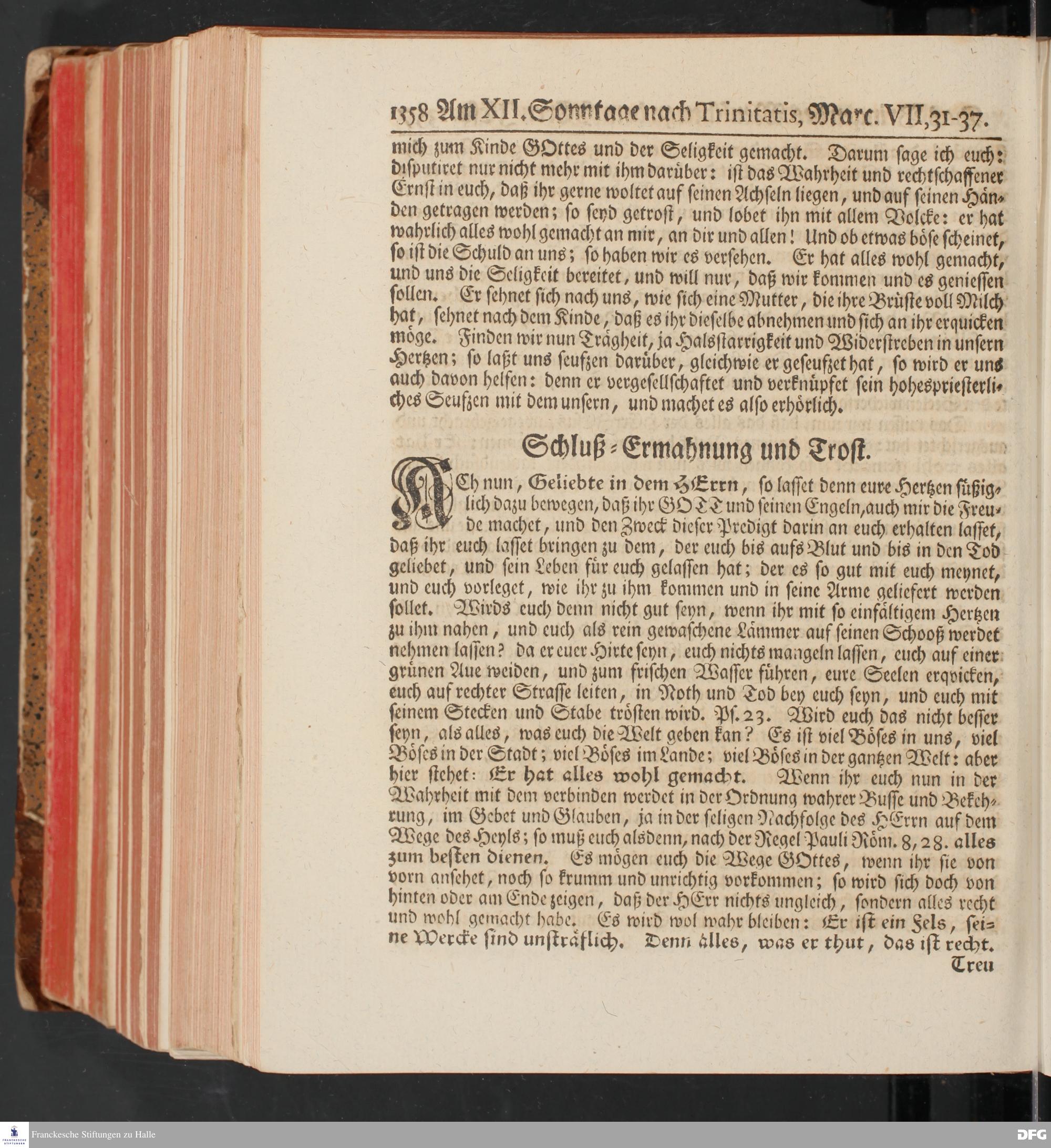August Hermann Franckens, S.Theol.Prof.und Past. Sonn= und Fest=Tags=Predigten / Welche Theils in Halle, theils an verschiedenen auswärtigen Oertern, von wichtigen und auserlesenen Materien gehalten worden, Nebst Vorbereitung auf die hohen Feste und nützlichen Registern. Dritte Auflage. HALLE, gedruckt und verlegt im Wäysen=Hause MDCCXL. Mit Königl.Preuß.und Churfl.Brandenb.Privileg.