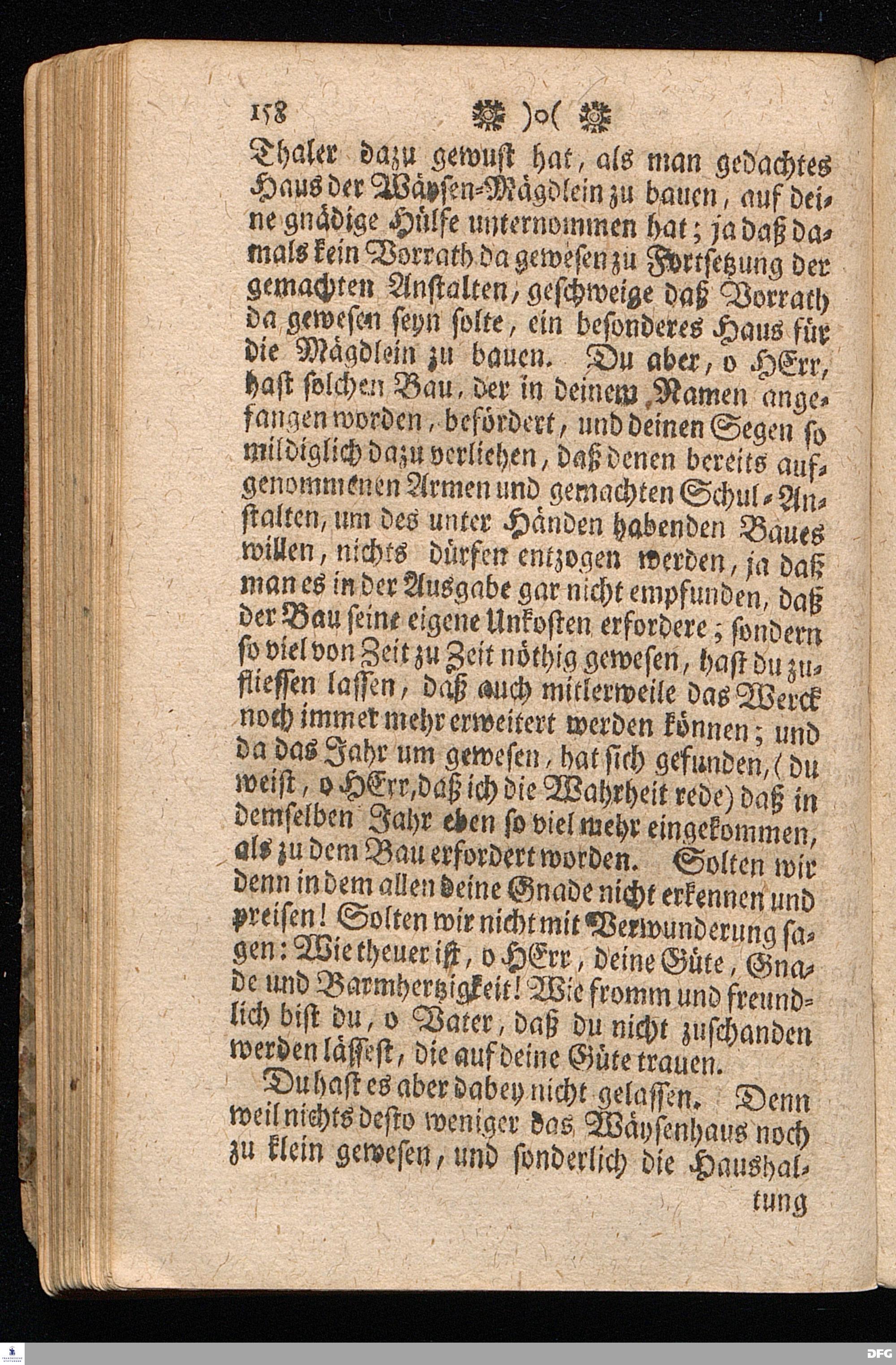 Der von GOTT in dem Wäysenhause zu Glaucha an Halle (für ietzo auf 500. Personen) Zubereitete Tisch / Nach seinem Anfang / Fortgang / gegenwärtigem Zustand und eingeführter Tisch=Ordnung kürtzlich beschrieben, mit angehängten 2. Erweckungs Reden / Deren die erste Anno 1699. [vielmehr 1700!] bey Einweihung des damaligen kleinern Speise=Saals, Die andere Anno 1711. bey Einweihung des grossen Saals gehalten worden, von August Hermann Francken / S.Theol.Prof.& Past.zu S.Ulrich / und des Gymnasii Scholarcha, h.t. Acad.Pro-Rectore. HALLE, In Verlegung des Wäysenhauses, MDCCXVII.