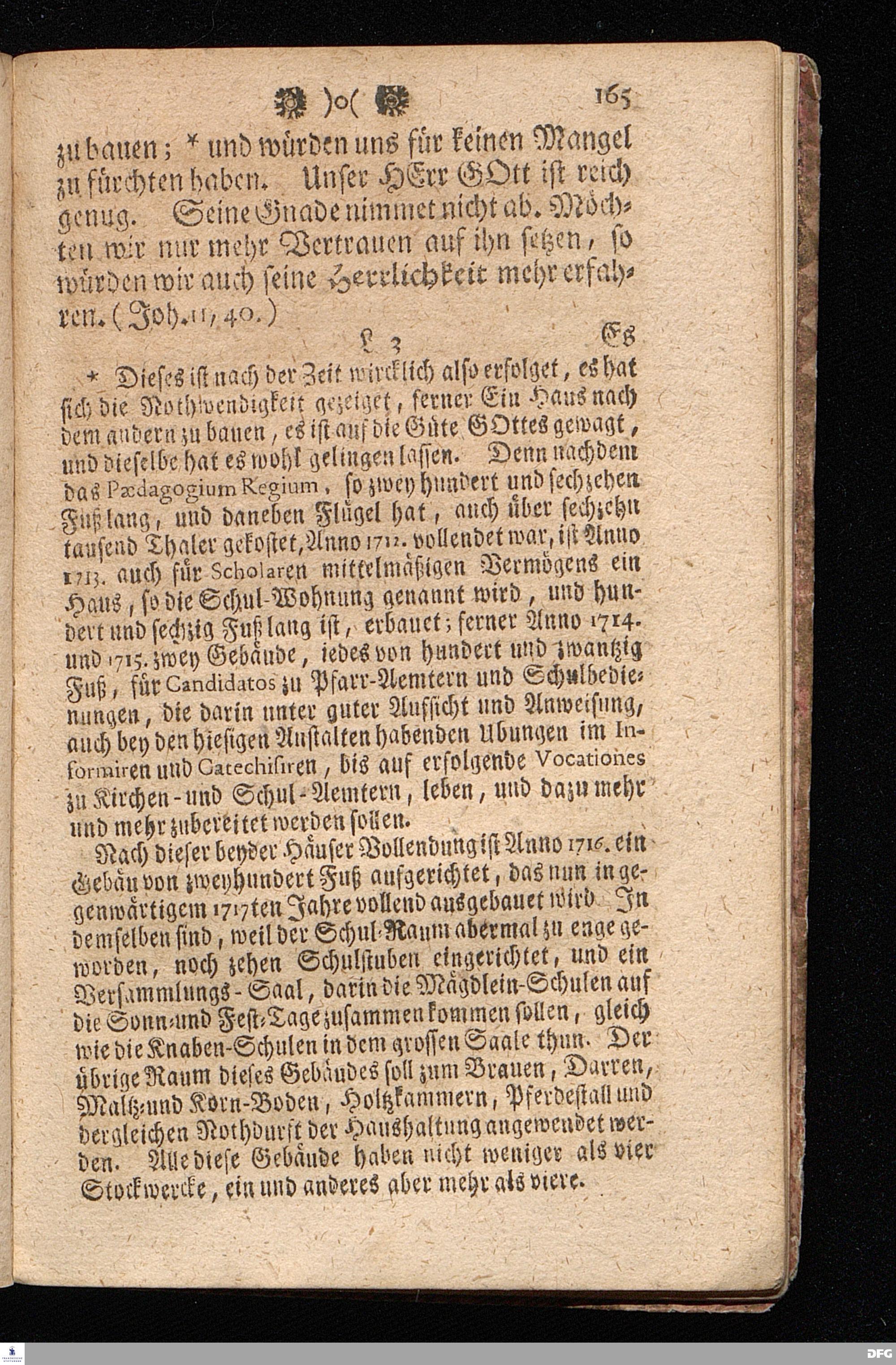 Der von GOTT in dem Wäysenhause zu Glaucha an Halle (für ietzo auf 500. Personen) Zubereitete Tisch / Nach seinem Anfang / Fortgang / gegenwärtigem Zustand und eingeführter Tisch=Ordnung kürtzlich beschrieben, mit angehängten 2. Erweckungs Reden / Deren die erste Anno 1699. [vielmehr 1700!] bey Einweihung des damaligen kleinern Speise=Saals, Die andere Anno 1711. bey Einweihung des grossen Saals gehalten worden, von August Hermann Francken / S.Theol.Prof.& Past.zu S.Ulrich / und des Gymnasii Scholarcha, h.t. Acad.Pro-Rectore. HALLE, In Verlegung des Wäysenhauses, MDCCXVII.