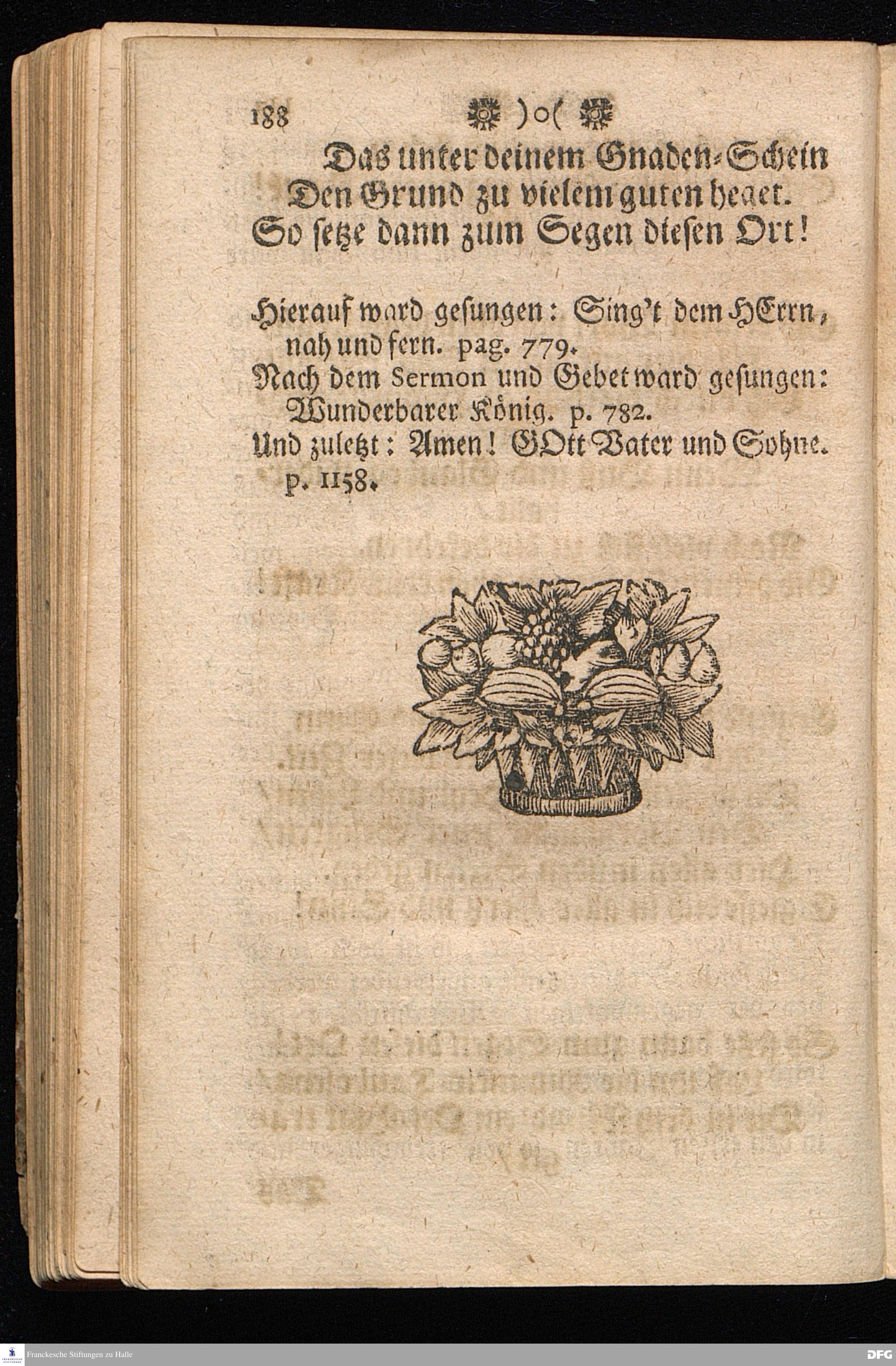 Der von GOTT in dem Wäysenhause zu Glaucha an Halle (für ietzo auf 500. Personen) Zubereitete Tisch / Nach seinem Anfang / Fortgang / gegenwärtigem Zustand und eingeführter Tisch=Ordnung kürtzlich beschrieben, mit angehängten 2. Erweckungs Reden / Deren die erste Anno 1699. [vielmehr 1700!] bey Einweihung des damaligen kleinern Speise=Saals, Die andere Anno 1711. bey Einweihung des grossen Saals gehalten worden, von August Hermann Francken / S.Theol.Prof.& Past.zu S.Ulrich / und des Gymnasii Scholarcha, h.t. Acad.Pro-Rectore. HALLE, In Verlegung des Wäysenhauses, MDCCXVII.