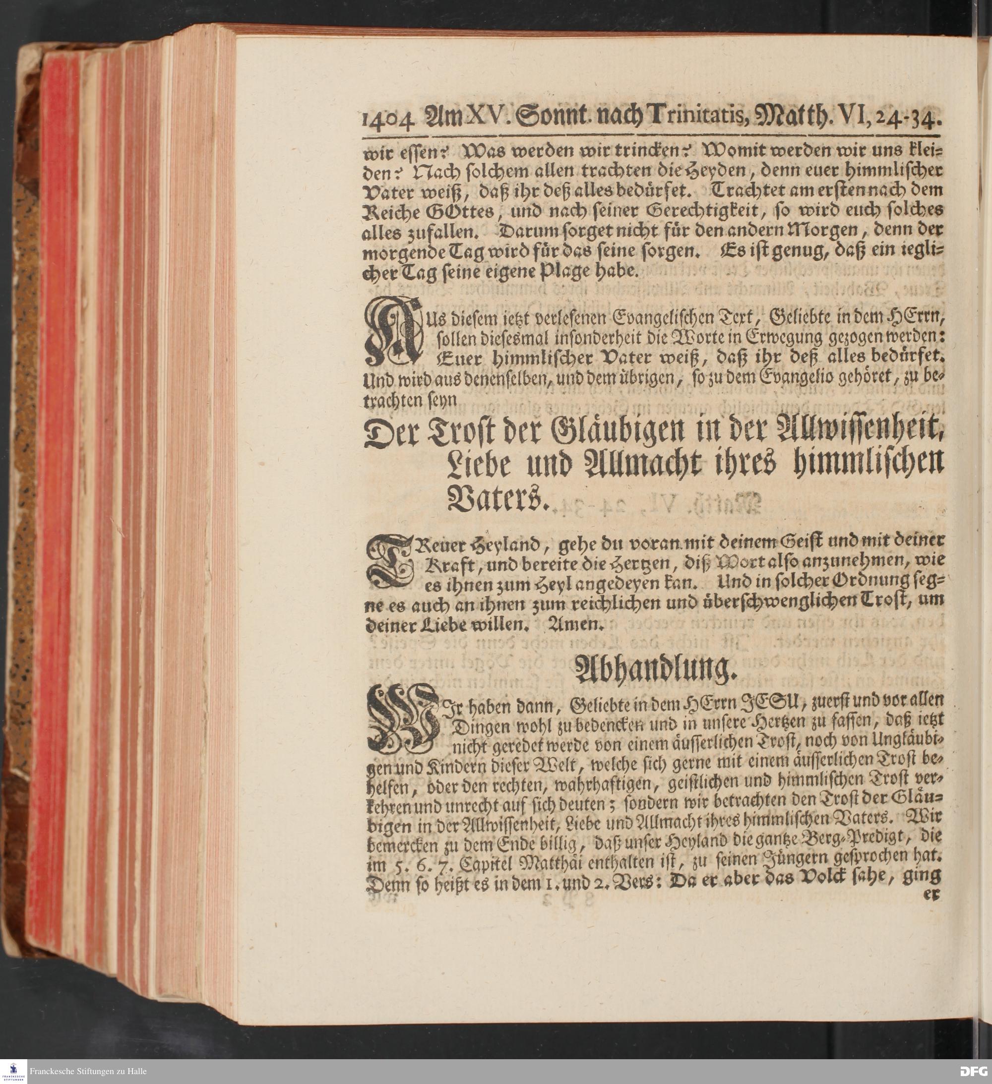 August Hermann Franckens, S.Theol.Prof.und Past. Sonn= und Fest=Tags=Predigten / Welche Theils in Halle, theils an verschiedenen auswärtigen Oertern, von wichtigen und auserlesenen Materien gehalten worden, Nebst Vorbereitung auf die hohen Feste und nützlichen Registern. Dritte Auflage. HALLE, gedruckt und verlegt im Wäysen=Hause MDCCXL. Mit Königl.Preuß.und Churfl.Brandenb.Privileg.