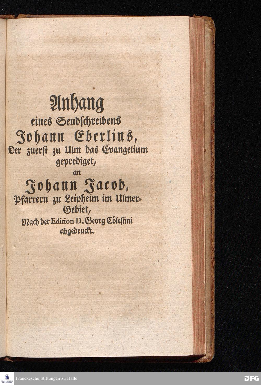 August Hermann Franckens, Weyl.S.Theol. Prof. Past. Vlric. et Schol.COLLEGIVM PASTORALE über D. Ioh. Ludouici Hartmanni Pastorale Euangelicum. Erster Theil; Nebst Johann Eberlins, ersten Predigers des Evangelii zu Ulm, Send=Schreiben an Johann Jacob, Pfarrern zu Leipheim im Ulmer=Gebiet, Wie sich ein Diener GOttes Worts in all seinem Thun halten soll, und sonderlich gegen denen, welchen das Evangelium zuvor nicht geprediget ist, daß sie sich nicht ärgern; Mit einer Vorrede herausgegeben von Gotthilf August Francken, S.Theol.Doct.und Prof.Publ.Ord.der ersten Dioeces des Saal-Creyses Insp.und Pred.zur L.Fr. HALLE, in Verlegung des Wäysenhauses. 1741.