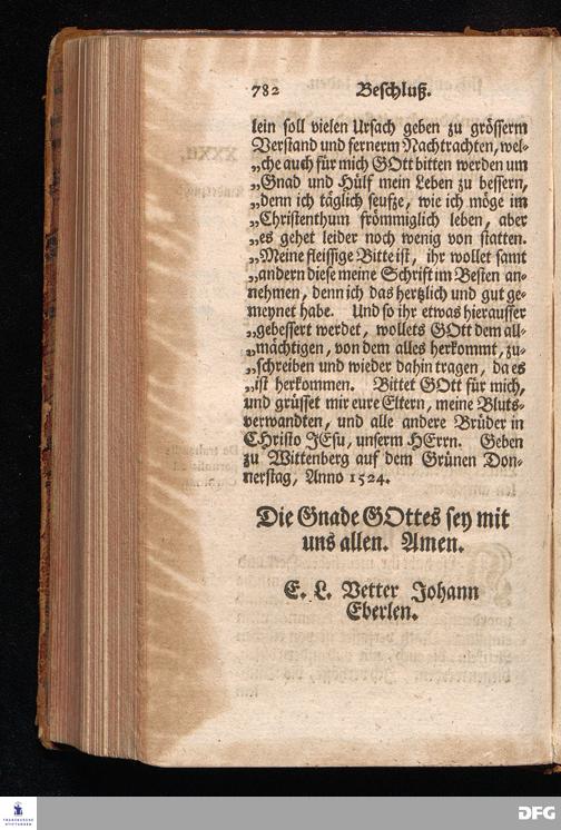August Hermann Franckens, Weyl.S.Theol. Prof. Past. Vlric. et Schol.COLLEGIVM PASTORALE über D. Ioh. Ludouici Hartmanni Pastorale Euangelicum. Erster Theil; Nebst Johann Eberlins, ersten Predigers des Evangelii zu Ulm, Send=Schreiben an Johann Jacob, Pfarrern zu Leipheim im Ulmer=Gebiet, Wie sich ein Diener GOttes Worts in all seinem Thun halten soll, und sonderlich gegen denen, welchen das Evangelium zuvor nicht geprediget ist, daß sie sich nicht ärgern; Mit einer Vorrede herausgegeben von Gotthilf August Francken, S.Theol.Doct.und Prof.Publ.Ord.der ersten Dioeces des Saal-Creyses Insp.und Pred.zur L.Fr. HALLE, in Verlegung des Wäysenhauses. 1741.