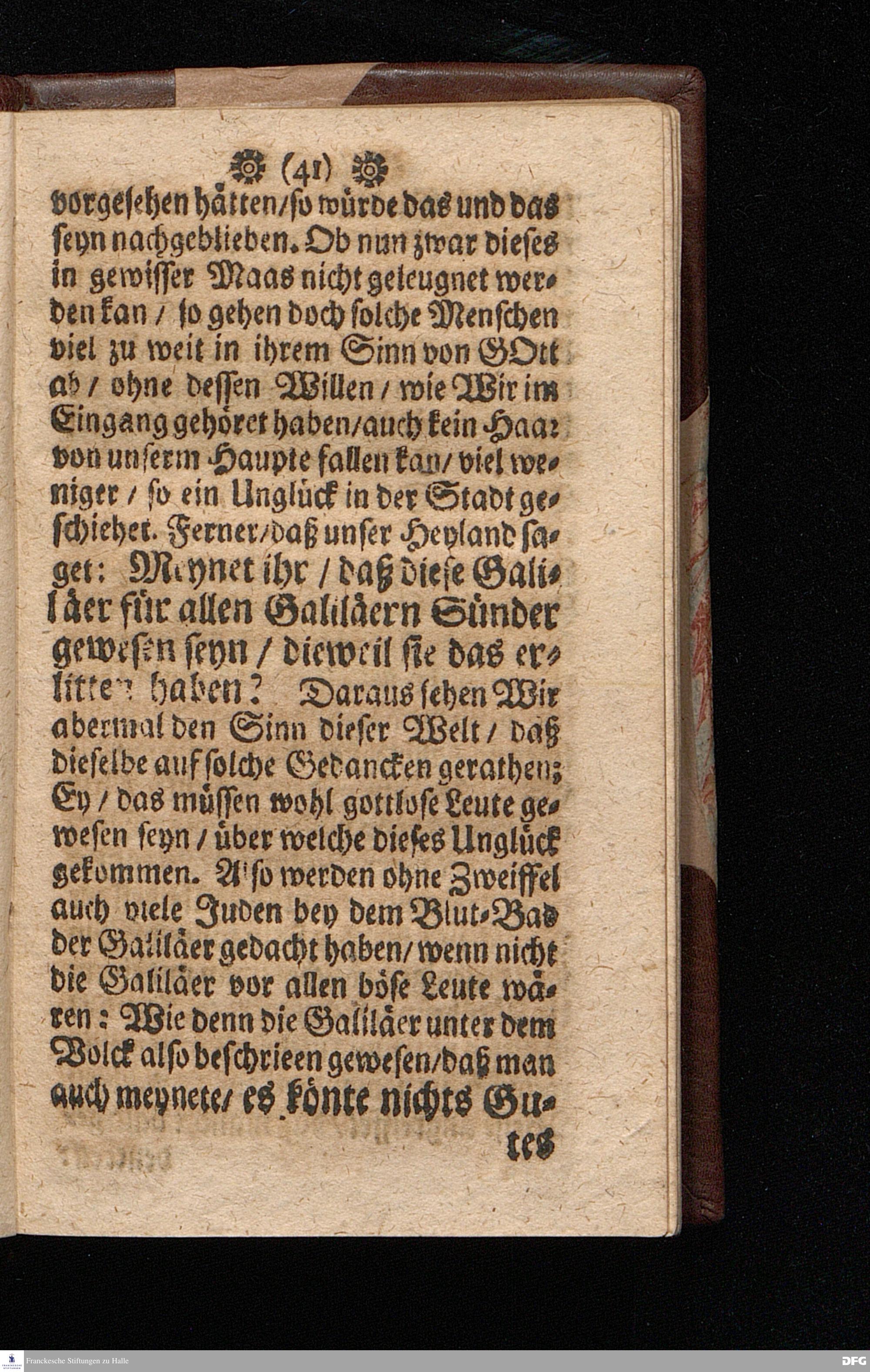 Die Vorboten Der schweren Gerichte Gottes / In einer Leichen=Predigt über Luc.XIII. v.1--9. Beym Begräbnis etlicher von einem Sand=Berge erschlagenen Personen / Den 9.April.1698. In der S.Georgen=Kirche / zu Glaucha an Halle / vorgestellt von M.August Hermann Francken / Gr.& OO.LL.P.P.& Past.Glauch. Anno 1698.