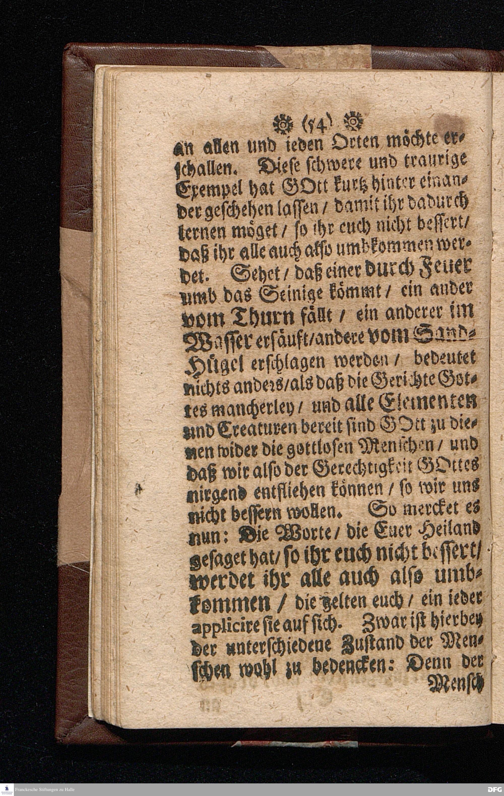 Die Vorboten Der schweren Gerichte Gottes / In einer Leichen=Predigt über Luc.XIII. v.1--9. Beym Begräbnis etlicher von einem Sand=Berge erschlagenen Personen / Den 9.April.1698. In der S.Georgen=Kirche / zu Glaucha an Halle / vorgestellt von M.August Hermann Francken / Gr.& OO.LL.P.P.& Past.Glauch. Anno 1698.