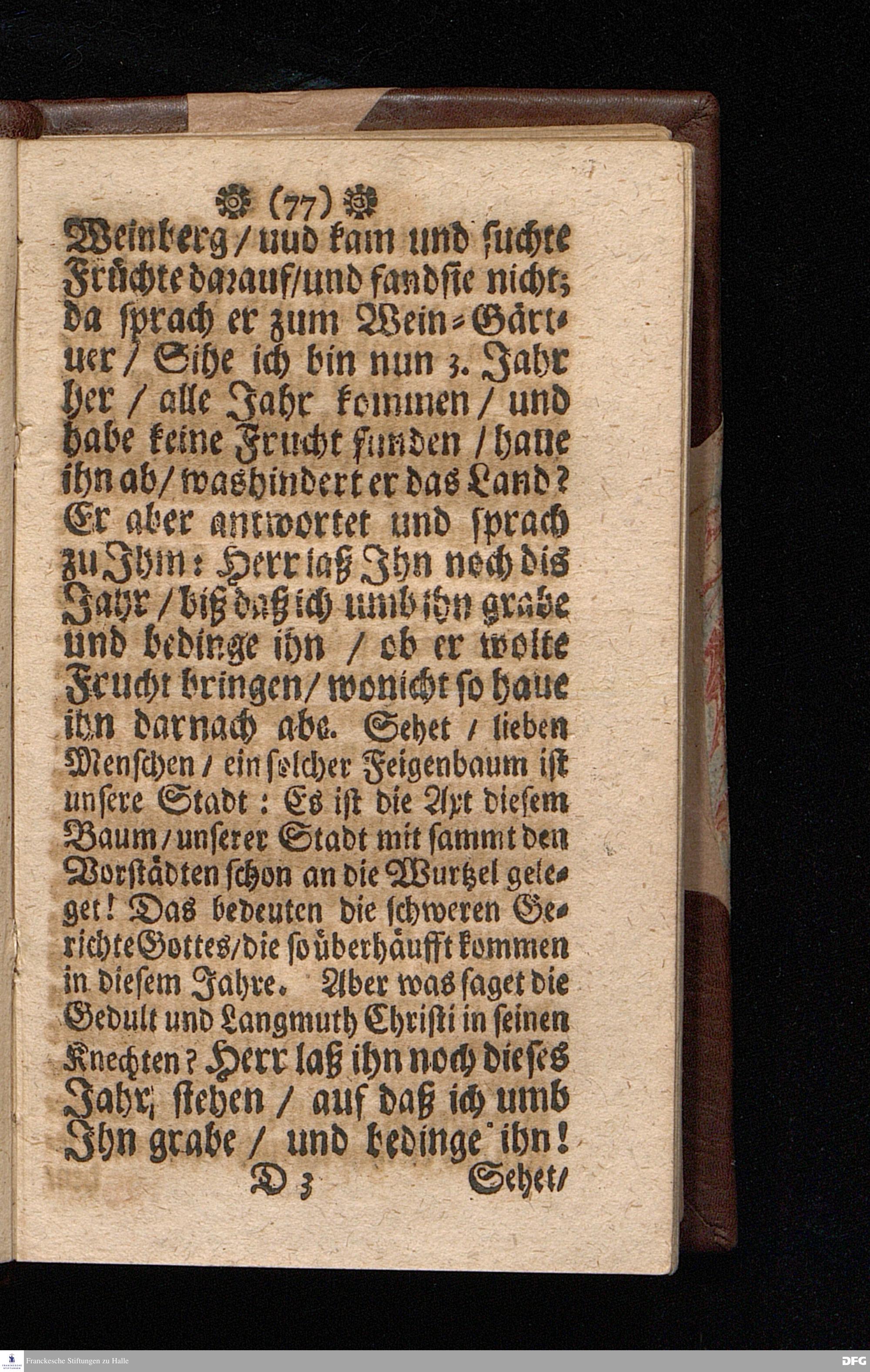 Die Vorboten Der schweren Gerichte Gottes / In einer Leichen=Predigt über Luc.XIII. v.1--9. Beym Begräbnis etlicher von einem Sand=Berge erschlagenen Personen / Den 9.April.1698. In der S.Georgen=Kirche / zu Glaucha an Halle / vorgestellt von M.August Hermann Francken / Gr.& OO.LL.P.P.& Past.Glauch. Anno 1698.