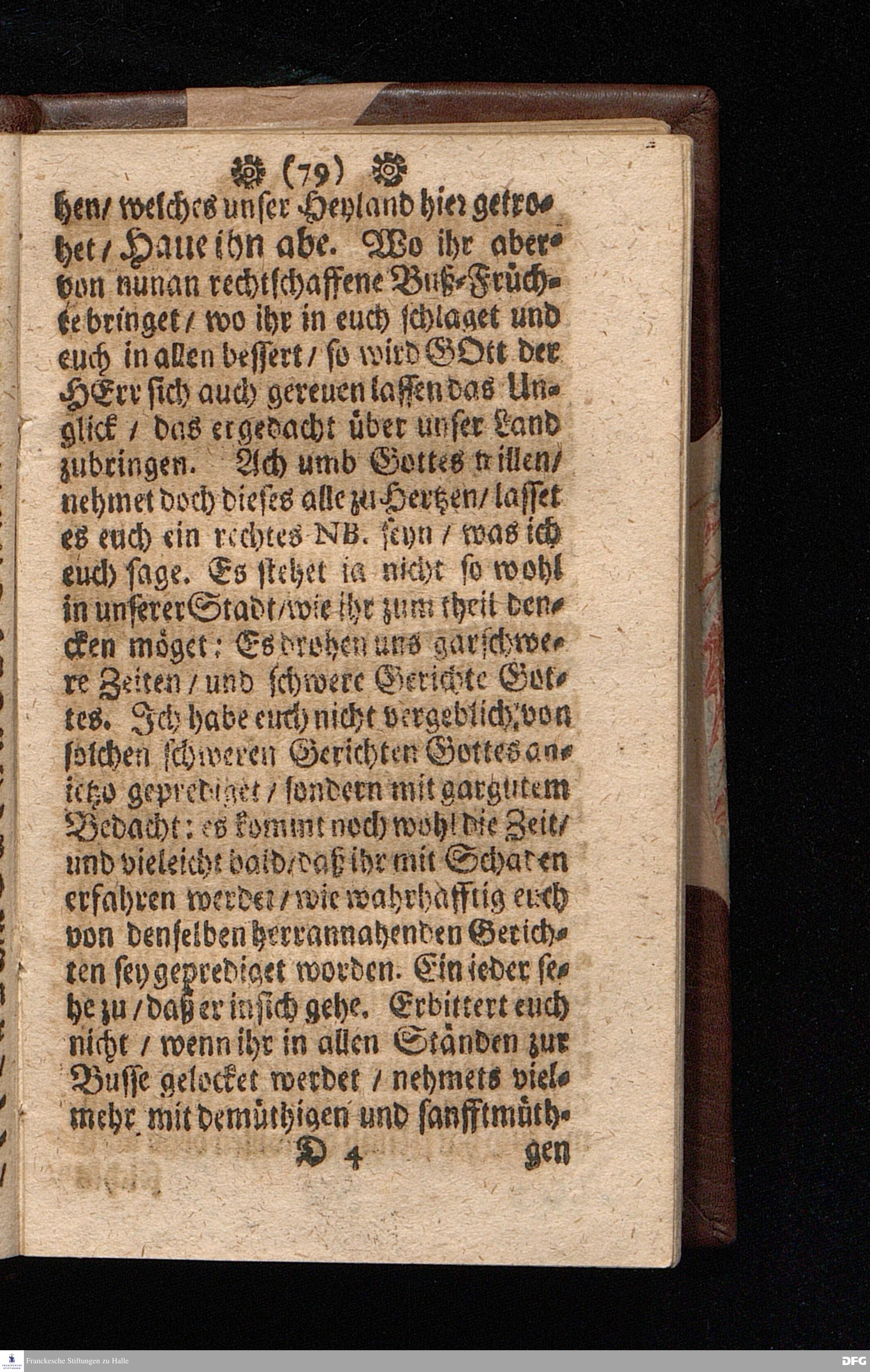 Die Vorboten Der schweren Gerichte Gottes / In einer Leichen=Predigt über Luc.XIII. v.1--9. Beym Begräbnis etlicher von einem Sand=Berge erschlagenen Personen / Den 9.April.1698. In der S.Georgen=Kirche / zu Glaucha an Halle / vorgestellt von M.August Hermann Francken / Gr.& OO.LL.P.P.& Past.Glauch. Anno 1698.