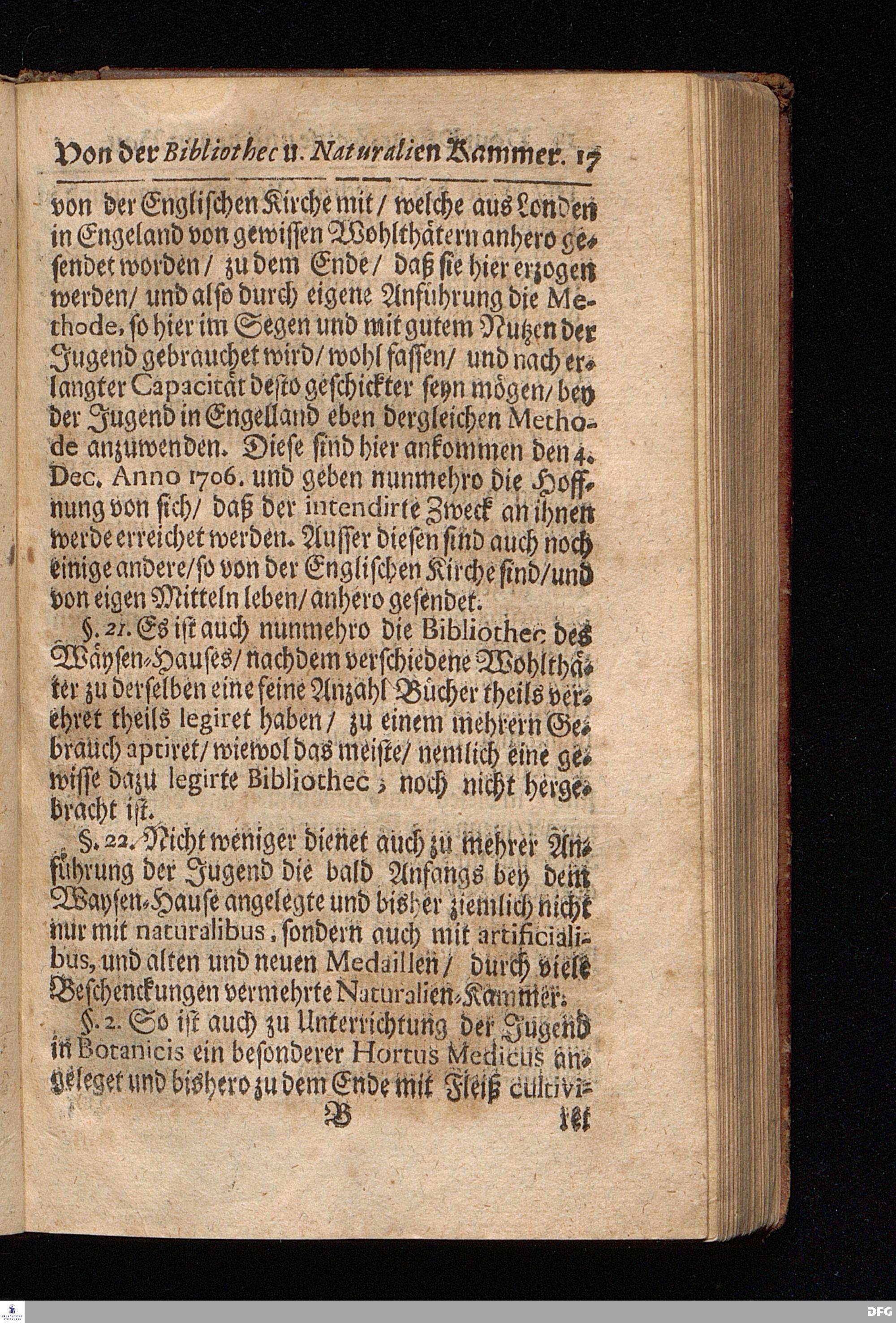 Kurtze und deutich[!] Nachricht / in welcher Verfassung Die zu Glaucha an Halle Beydes zur Erziehung der Jugend / und zur Aufnehmung / Auch nöthiger Verpflegung der Dürfftigen gemachte Anstalten Sich ietziger Zeit im Julio 1709. befinden / zu künfftiger VII.Fortsetzung vorläuffig ertheilet / von August Hermann Francken / S.Theol.Prof.und Past. HALLE / im Wäysen=Hause.