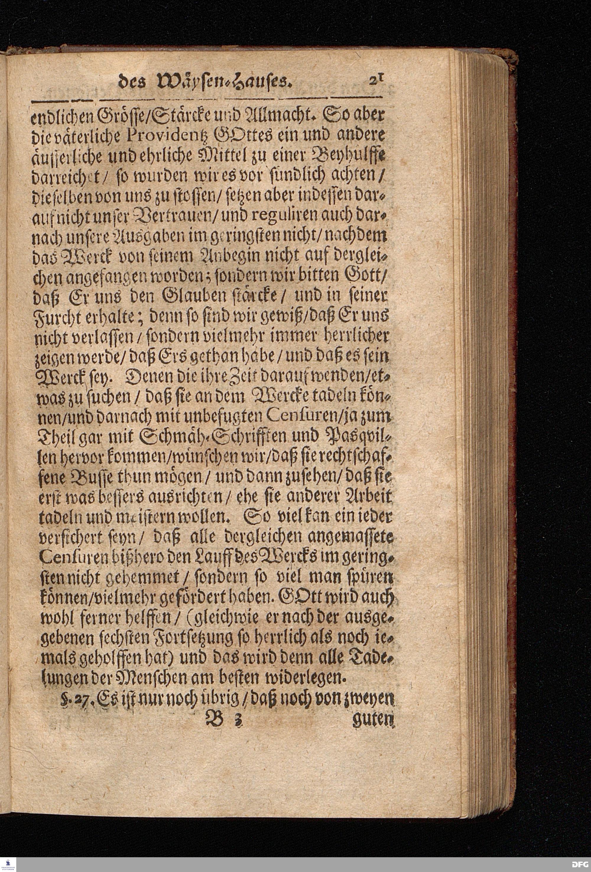 Kurtze und deutich[!] Nachricht / in welcher Verfassung Die zu Glaucha an Halle Beydes zur Erziehung der Jugend / und zur Aufnehmung / Auch nöthiger Verpflegung der Dürfftigen gemachte Anstalten Sich ietziger Zeit im Julio 1709. befinden / zu künfftiger VII.Fortsetzung vorläuffig ertheilet / von August Hermann Francken / S.Theol.Prof.und Past. HALLE / im Wäysen=Hause.