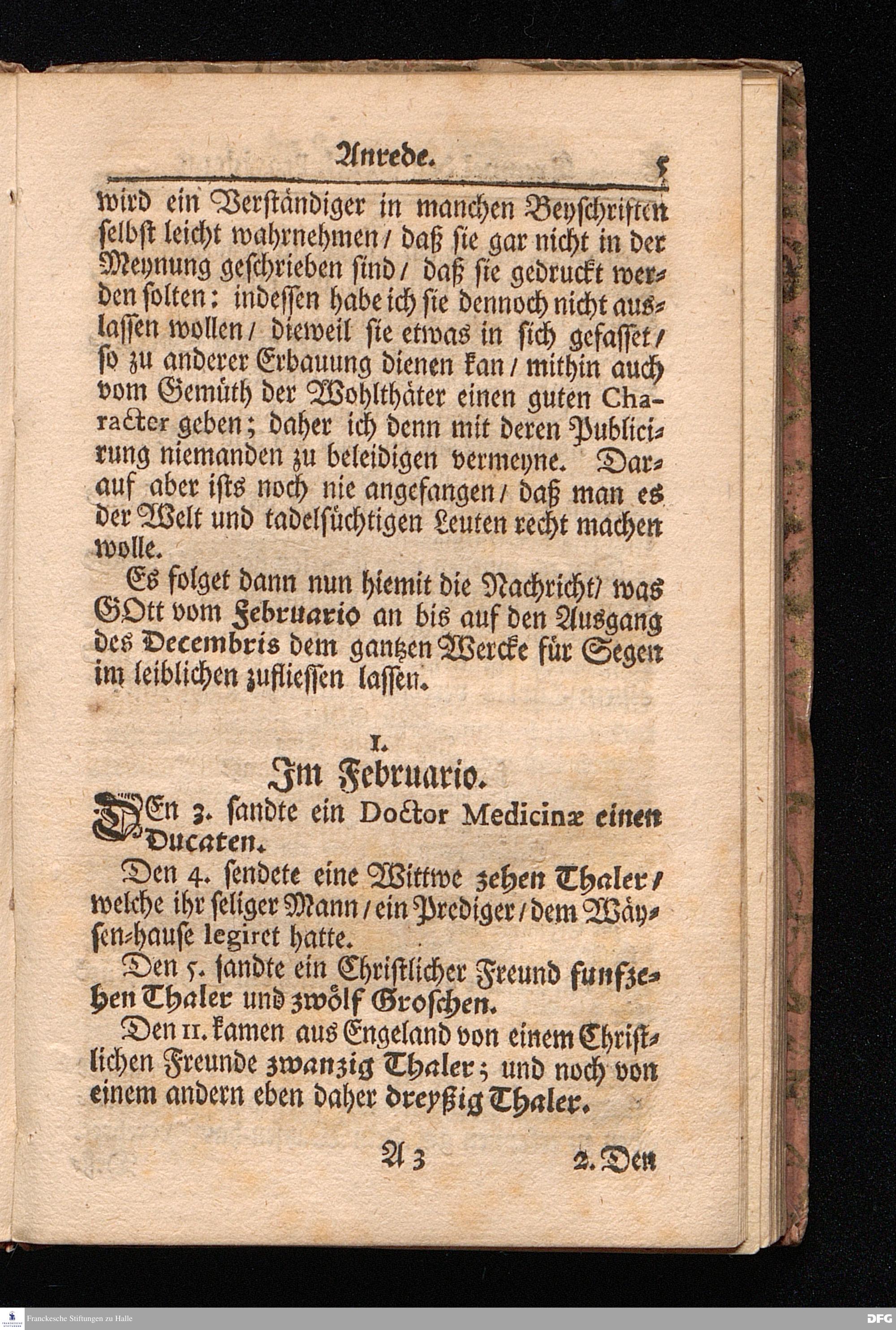 Die VI. Fortsetzung Der Wahrhaften und umständlichen Nachricht Vom Wäysen=Hause und übrigen Anstalten zu Glaucha vor Halle/ Bis zu Ende des Jahres Anno 1708. In einem abermaligen Send=Schreiben an den Hoch=Wohlgebohrnen Herrn, Herrn Carl Hildebrand, Freyherrn von Canstein, auf Canstein, Schönberg und Neukirchen ec. Erb=Herrn, abgefasset, Von August Hermann Francken/ S. Theol. Prof. zu Halle, und Past. zu Glaucha vor Halle. HALLE, im Wäysen=Hause. 1709