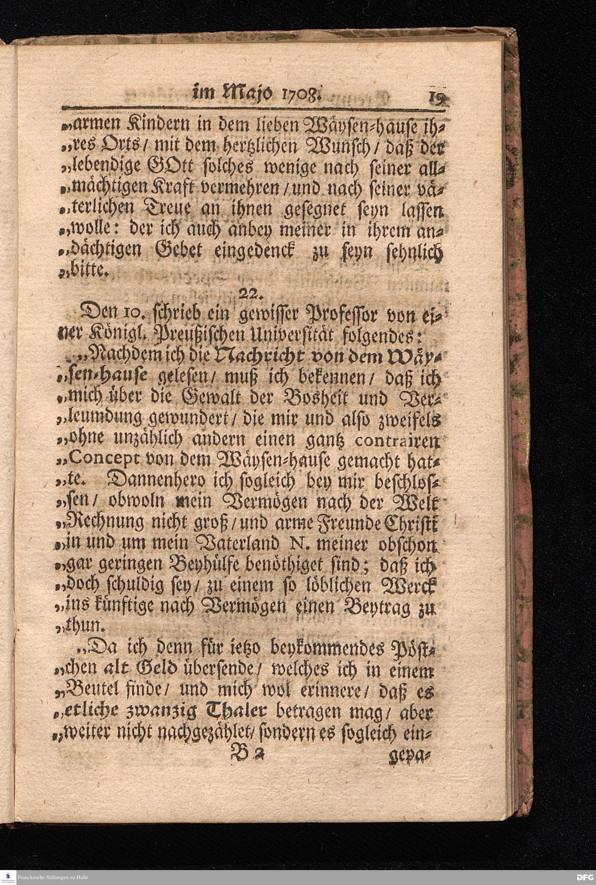 Die VI. Fortsetzung Der Wahrhaften und umständlichen Nachricht Vom Wäysen=Hause und übrigen Anstalten zu Glaucha vor Halle/ Bis zu Ende des Jahres Anno 1708. In einem abermaligen Send=Schreiben an den Hoch=Wohlgebohrnen Herrn, Herrn Carl Hildebrand, Freyherrn von Canstein, auf Canstein, Schönberg und Neukirchen ec. Erb=Herrn, abgefasset, Von August Hermann Francken/ S. Theol. Prof. zu Halle, und Past. zu Glaucha vor Halle. HALLE, im Wäysen=Hause. 1709