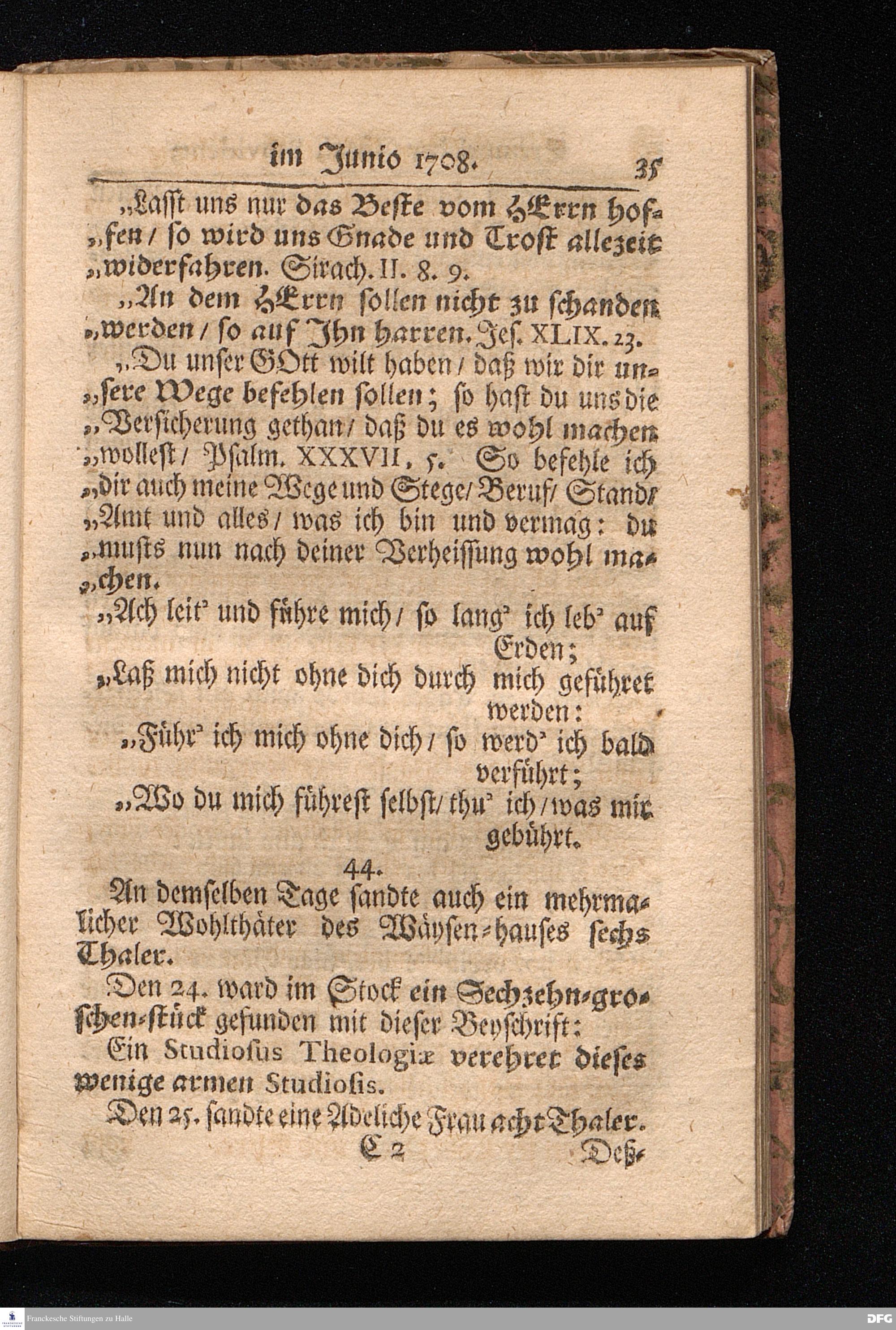 Die VI. Fortsetzung Der Wahrhaften und umständlichen Nachricht Vom Wäysen=Hause und übrigen Anstalten zu Glaucha vor Halle/ Bis zu Ende des Jahres Anno 1708. In einem abermaligen Send=Schreiben an den Hoch=Wohlgebohrnen Herrn, Herrn Carl Hildebrand, Freyherrn von Canstein, auf Canstein, Schönberg und Neukirchen ec. Erb=Herrn, abgefasset, Von August Hermann Francken/ S. Theol. Prof. zu Halle, und Past. zu Glaucha vor Halle. HALLE, im Wäysen=Hause. 1709