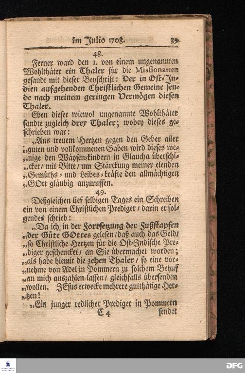 Die VI. Fortsetzung Der Wahrhaften und umständlichen Nachricht Vom Wäysen=Hause und übrigen Anstalten zu Glaucha vor Halle/ Bis zu Ende des Jahres Anno 1708. In einem abermaligen Send=Schreiben an den Hoch=Wohlgebohrnen Herrn, Herrn Carl Hildebrand, Freyherrn von Canstein, auf Canstein, Schönberg und Neukirchen ec. Erb=Herrn, abgefasset, Von August Hermann Francken/ S. Theol. Prof. zu Halle, und Past. zu Glaucha vor Halle. HALLE, im Wäysen=Hause. 1709