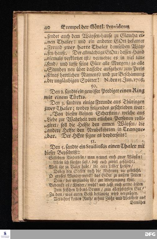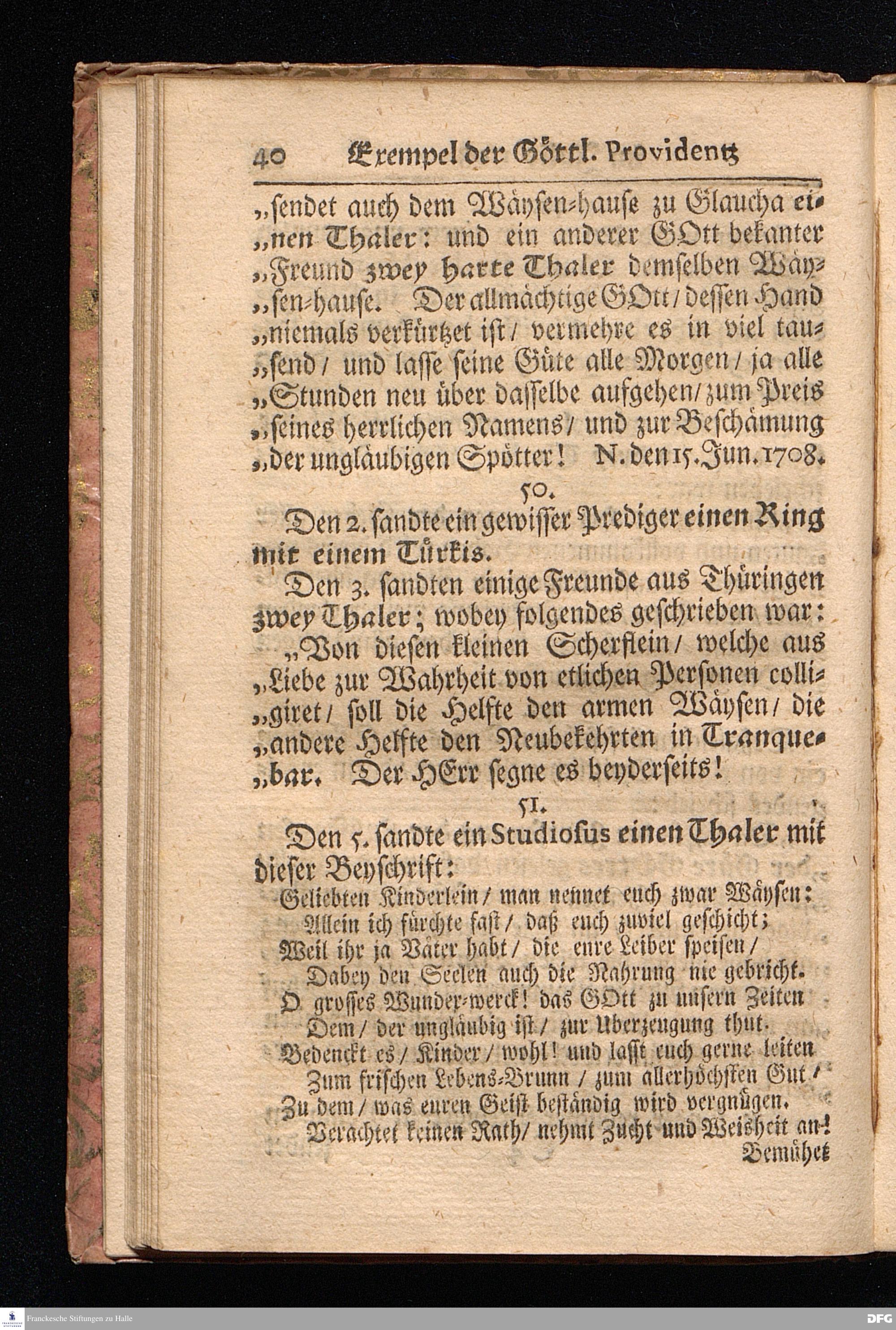 Die VI. Fortsetzung Der Wahrhaften und umständlichen Nachricht Vom Wäysen=Hause und übrigen Anstalten zu Glaucha vor Halle/ Bis zu Ende des Jahres Anno 1708. In einem abermaligen Send=Schreiben an den Hoch=Wohlgebohrnen Herrn, Herrn Carl Hildebrand, Freyherrn von Canstein, auf Canstein, Schönberg und Neukirchen ec. Erb=Herrn, abgefasset, Von August Hermann Francken/ S. Theol. Prof. zu Halle, und Past. zu Glaucha vor Halle. HALLE, im Wäysen=Hause. 1709
