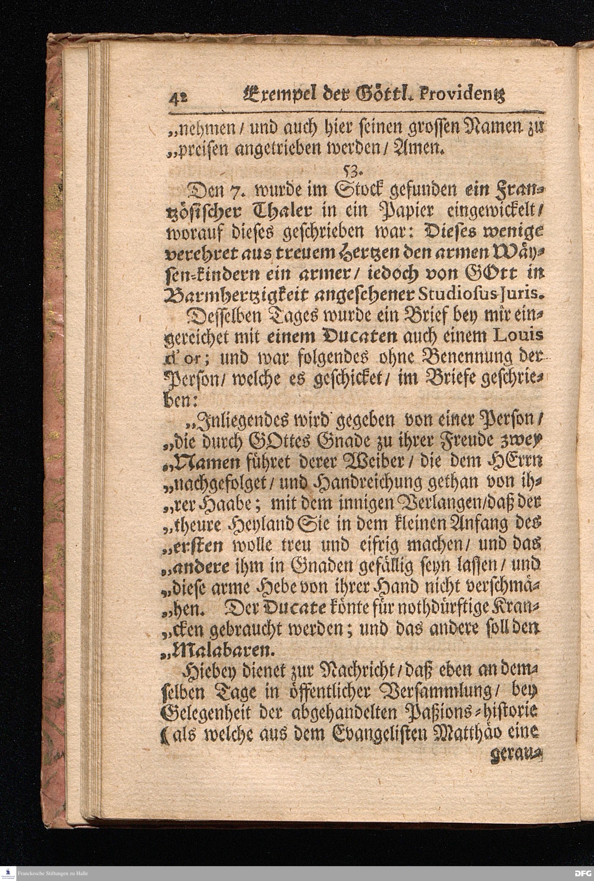 Die VI. Fortsetzung Der Wahrhaften und umständlichen Nachricht Vom Wäysen=Hause und übrigen Anstalten zu Glaucha vor Halle/ Bis zu Ende des Jahres Anno 1708. In einem abermaligen Send=Schreiben an den Hoch=Wohlgebohrnen Herrn, Herrn Carl Hildebrand, Freyherrn von Canstein, auf Canstein, Schönberg und Neukirchen ec. Erb=Herrn, abgefasset, Von August Hermann Francken/ S. Theol. Prof. zu Halle, und Past. zu Glaucha vor Halle. HALLE, im Wäysen=Hause. 1709