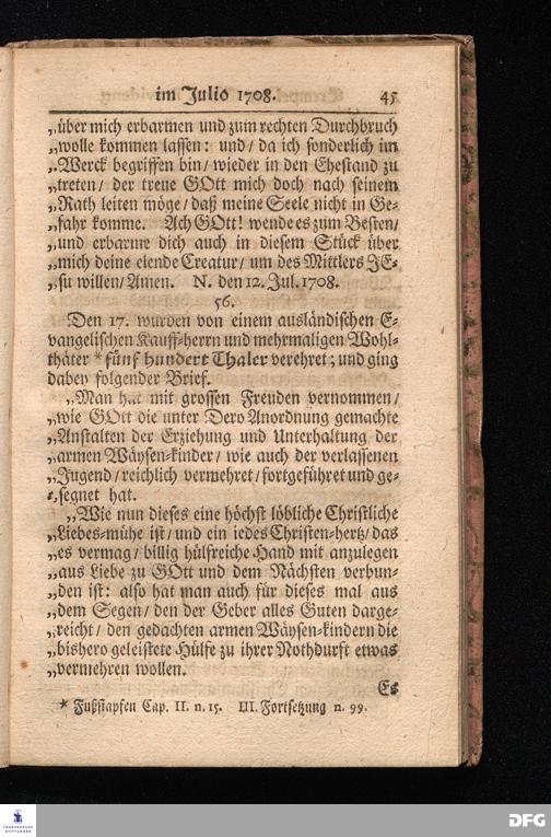 Die VI. Fortsetzung Der Wahrhaften und umständlichen Nachricht Vom Wäysen=Hause und übrigen Anstalten zu Glaucha vor Halle/ Bis zu Ende des Jahres Anno 1708. In einem abermaligen Send=Schreiben an den Hoch=Wohlgebohrnen Herrn, Herrn Carl Hildebrand, Freyherrn von Canstein, auf Canstein, Schönberg und Neukirchen ec. Erb=Herrn, abgefasset, Von August Hermann Francken/ S. Theol. Prof. zu Halle, und Past. zu Glaucha vor Halle. HALLE, im Wäysen=Hause. 1709