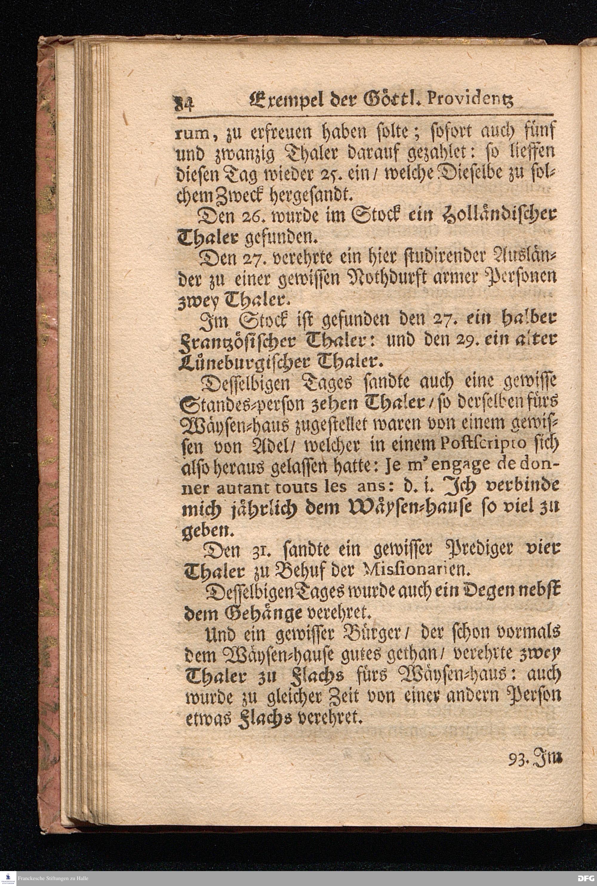 Die VI. Fortsetzung Der Wahrhaften und umständlichen Nachricht Vom Wäysen=Hause und übrigen Anstalten zu Glaucha vor Halle/ Bis zu Ende des Jahres Anno 1708. In einem abermaligen Send=Schreiben an den Hoch=Wohlgebohrnen Herrn, Herrn Carl Hildebrand, Freyherrn von Canstein, auf Canstein, Schönberg und Neukirchen ec. Erb=Herrn, abgefasset, Von August Hermann Francken/ S. Theol. Prof. zu Halle, und Past. zu Glaucha vor Halle. HALLE, im Wäysen=Hause. 1709