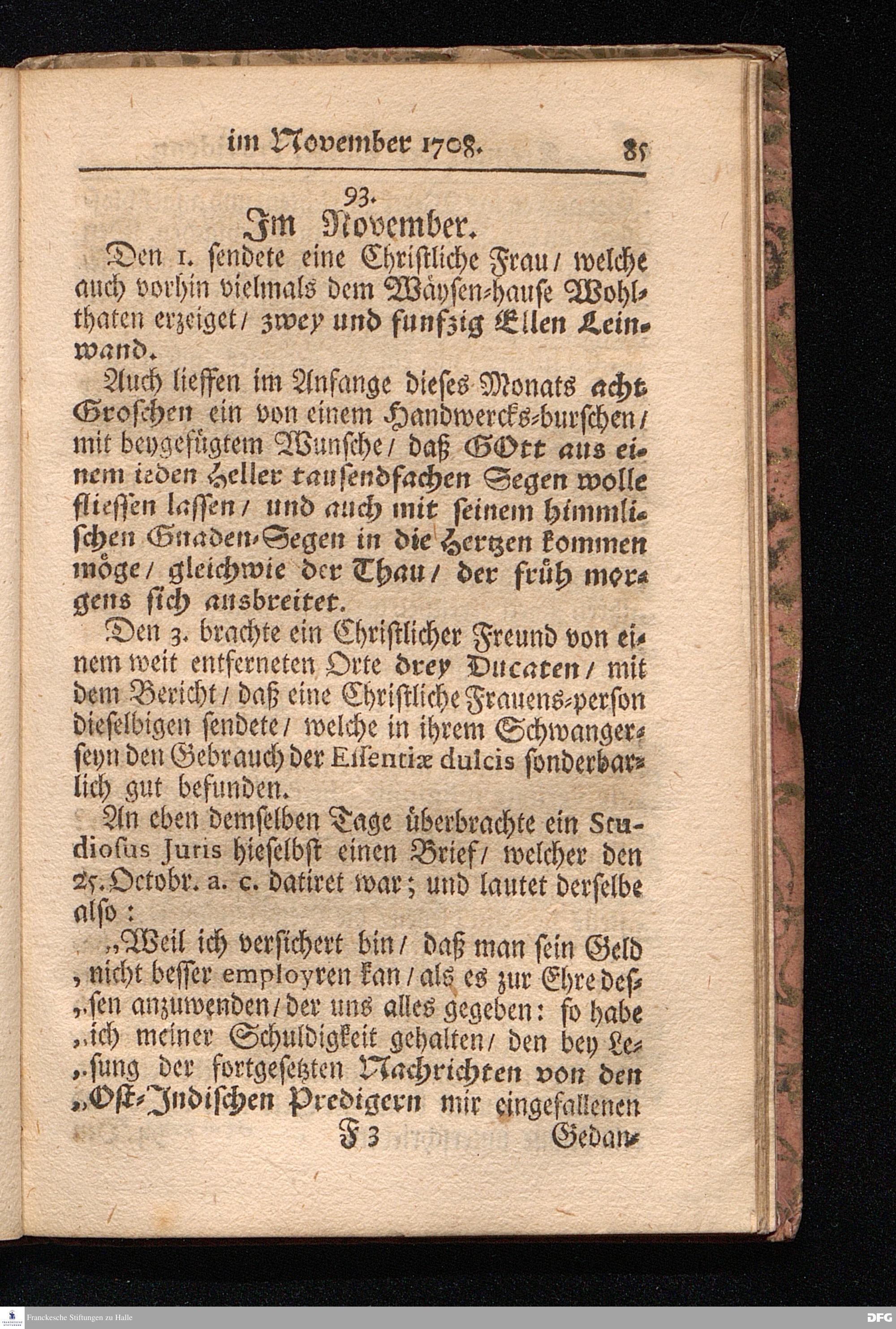 Die VI. Fortsetzung Der Wahrhaften und umständlichen Nachricht Vom Wäysen=Hause und übrigen Anstalten zu Glaucha vor Halle/ Bis zu Ende des Jahres Anno 1708. In einem abermaligen Send=Schreiben an den Hoch=Wohlgebohrnen Herrn, Herrn Carl Hildebrand, Freyherrn von Canstein, auf Canstein, Schönberg und Neukirchen ec. Erb=Herrn, abgefasset, Von August Hermann Francken/ S. Theol. Prof. zu Halle, und Past. zu Glaucha vor Halle. HALLE, im Wäysen=Hause. 1709