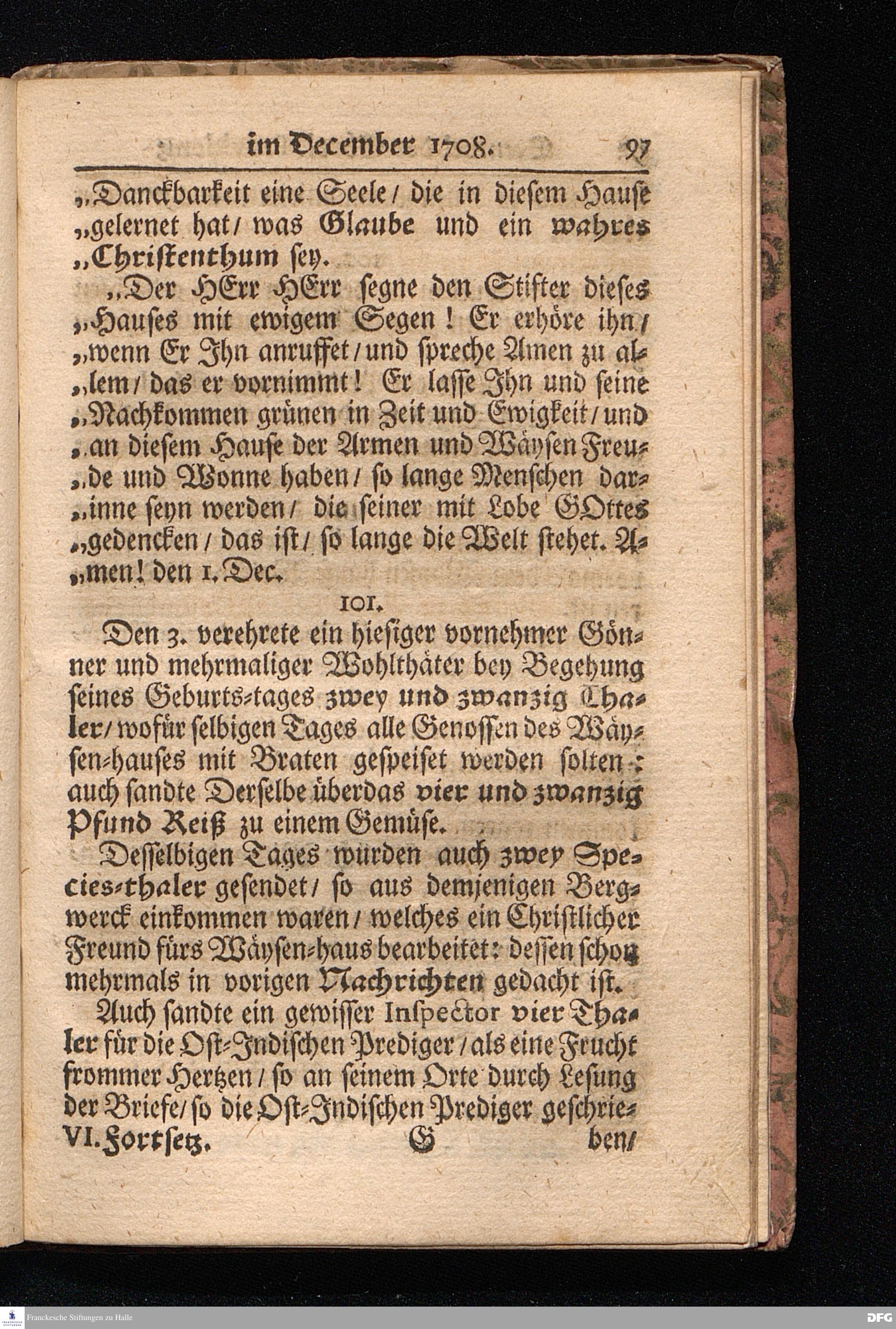 Die VI. Fortsetzung Der Wahrhaften und umständlichen Nachricht Vom Wäysen=Hause und übrigen Anstalten zu Glaucha vor Halle/ Bis zu Ende des Jahres Anno 1708. In einem abermaligen Send=Schreiben an den Hoch=Wohlgebohrnen Herrn, Herrn Carl Hildebrand, Freyherrn von Canstein, auf Canstein, Schönberg und Neukirchen ec. Erb=Herrn, abgefasset, Von August Hermann Francken/ S. Theol. Prof. zu Halle, und Past. zu Glaucha vor Halle. HALLE, im Wäysen=Hause. 1709