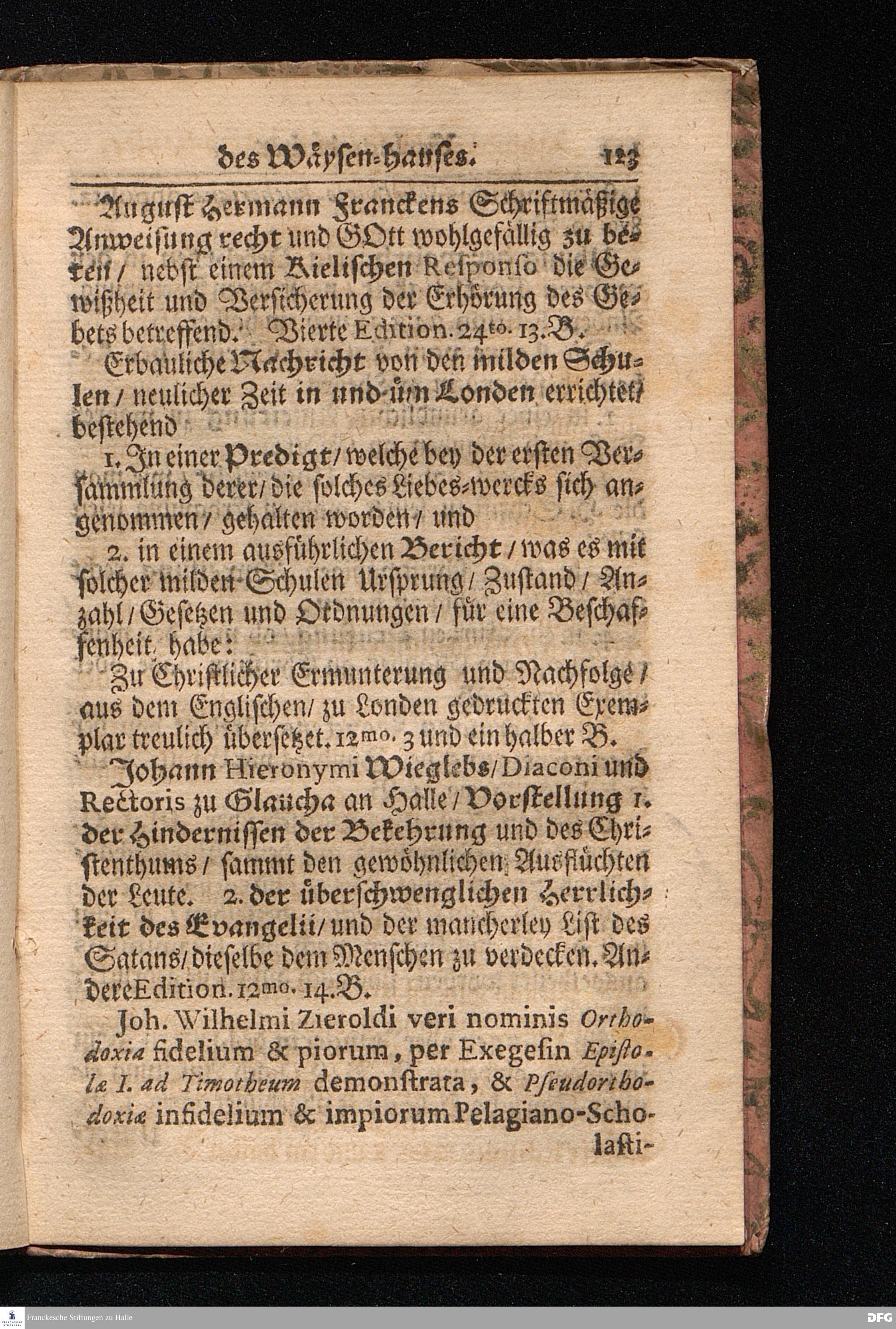 Die VI. Fortsetzung Der Wahrhaften und umständlichen Nachricht Vom Wäysen=Hause und übrigen Anstalten zu Glaucha vor Halle/ Bis zu Ende des Jahres Anno 1708. In einem abermaligen Send=Schreiben an den Hoch=Wohlgebohrnen Herrn, Herrn Carl Hildebrand, Freyherrn von Canstein, auf Canstein, Schönberg und Neukirchen ec. Erb=Herrn, abgefasset, Von August Hermann Francken/ S. Theol. Prof. zu Halle, und Past. zu Glaucha vor Halle. HALLE, im Wäysen=Hause. 1709
