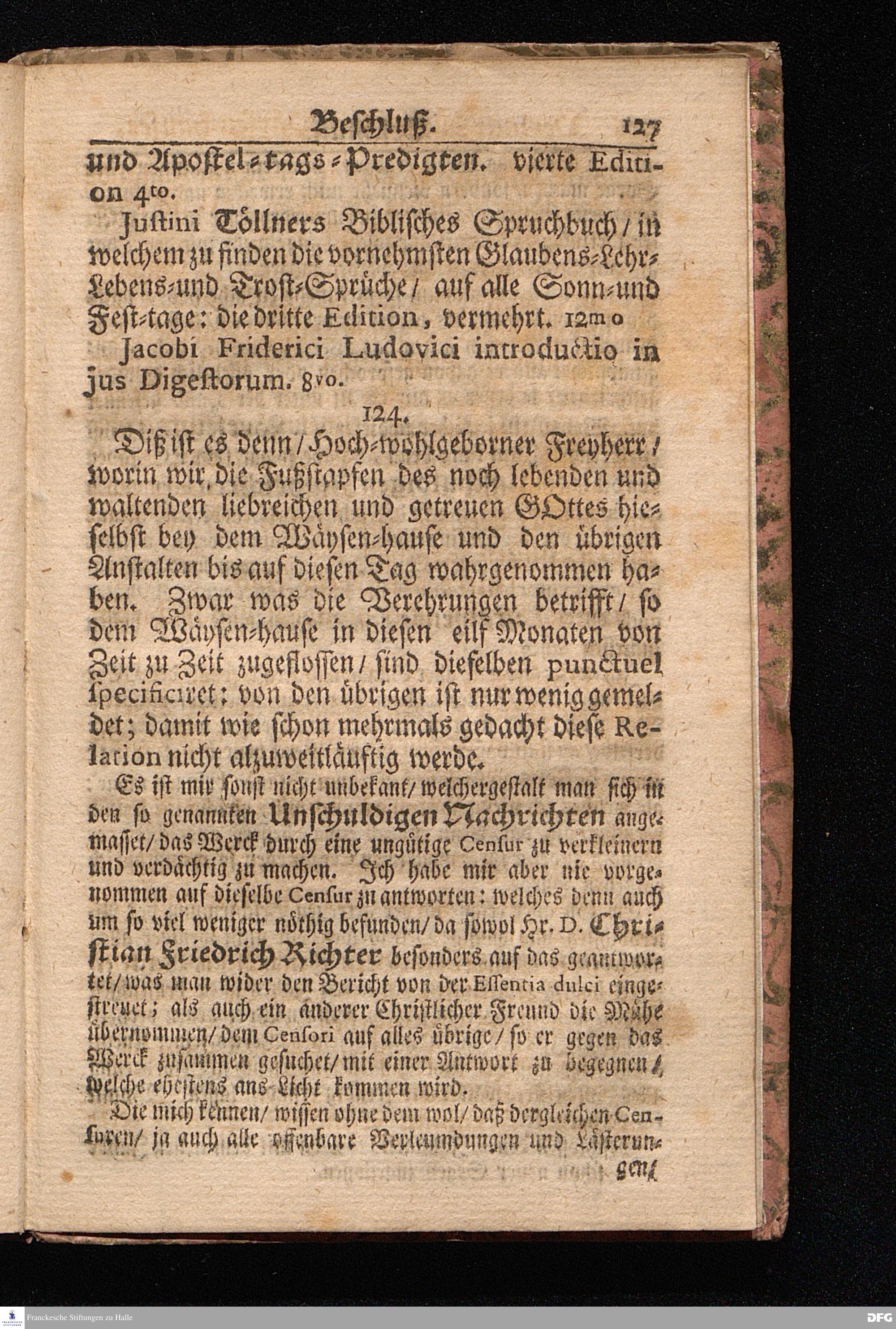 Die VI. Fortsetzung Der Wahrhaften und umständlichen Nachricht Vom Wäysen=Hause und übrigen Anstalten zu Glaucha vor Halle/ Bis zu Ende des Jahres Anno 1708. In einem abermaligen Send=Schreiben an den Hoch=Wohlgebohrnen Herrn, Herrn Carl Hildebrand, Freyherrn von Canstein, auf Canstein, Schönberg und Neukirchen ec. Erb=Herrn, abgefasset, Von August Hermann Francken/ S. Theol. Prof. zu Halle, und Past. zu Glaucha vor Halle. HALLE, im Wäysen=Hause. 1709