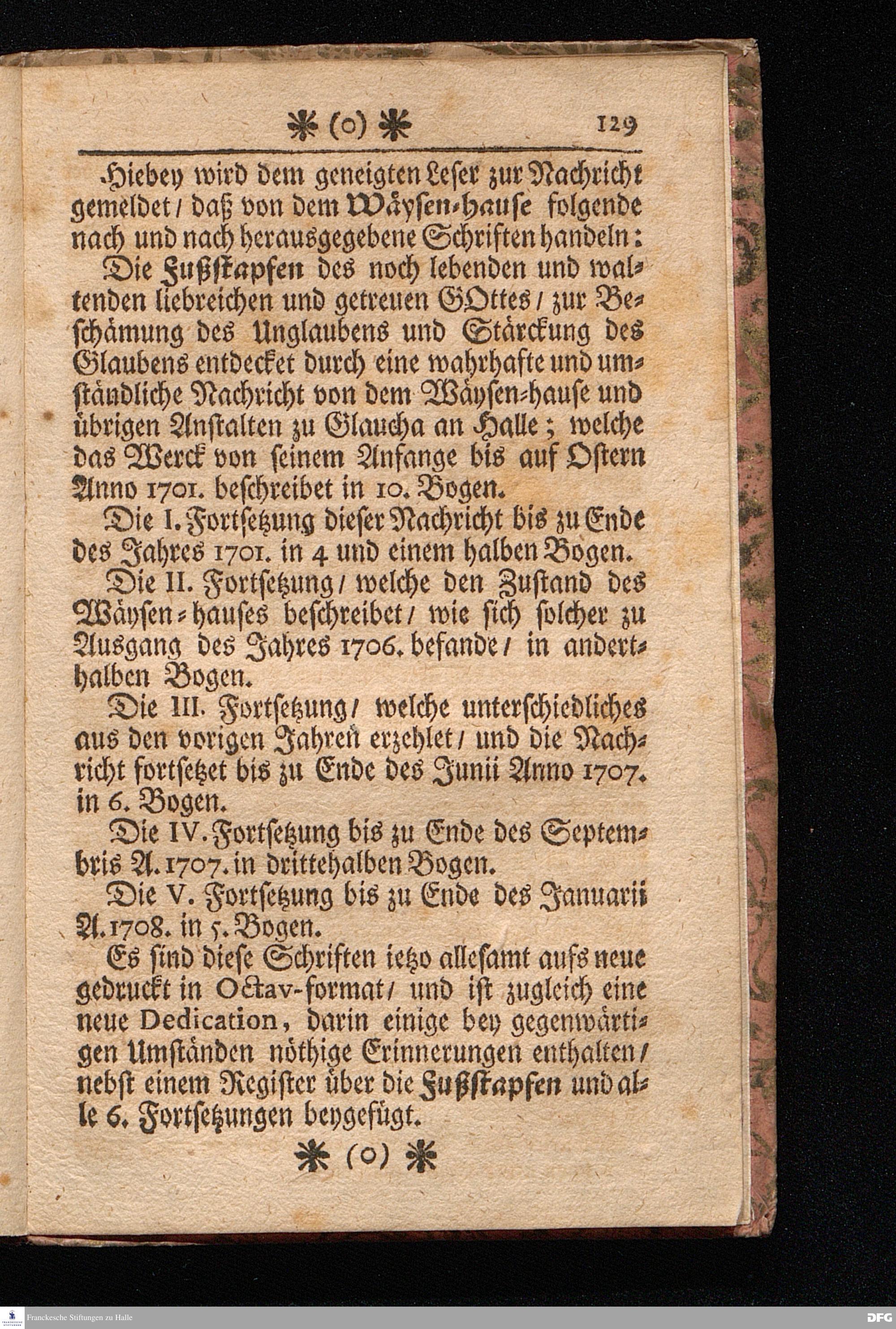 Die VI. Fortsetzung Der Wahrhaften und umständlichen Nachricht Vom Wäysen=Hause und übrigen Anstalten zu Glaucha vor Halle/ Bis zu Ende des Jahres Anno 1708. In einem abermaligen Send=Schreiben an den Hoch=Wohlgebohrnen Herrn, Herrn Carl Hildebrand, Freyherrn von Canstein, auf Canstein, Schönberg und Neukirchen ec. Erb=Herrn, abgefasset, Von August Hermann Francken/ S. Theol. Prof. zu Halle, und Past. zu Glaucha vor Halle. HALLE, im Wäysen=Hause. 1709