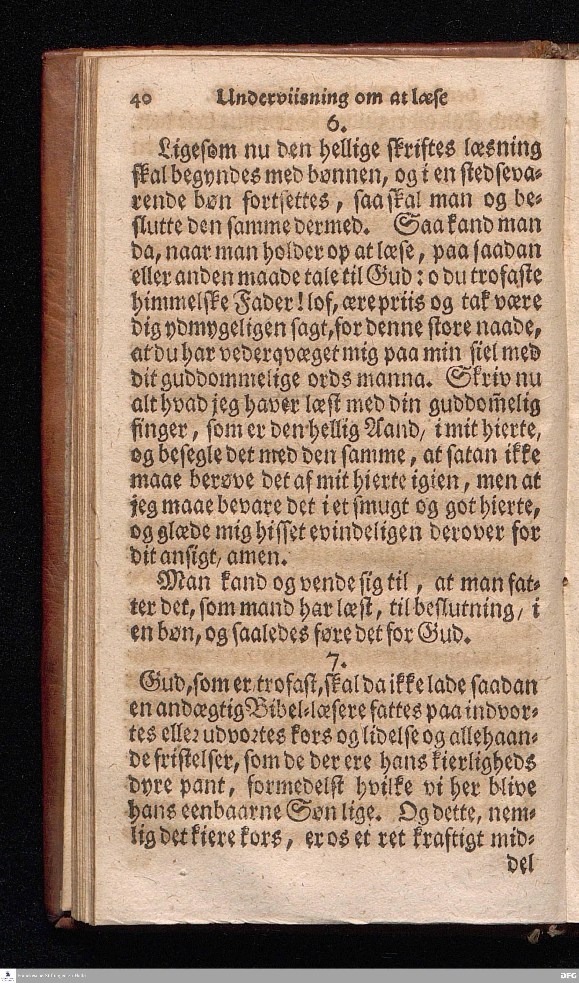 Lærdom Om Et christeligt Levnets Begyndelse, Som indeholder fire Deele: 1. En grundig Anviisning til sand bod og troe paa Gud. 2. En enfoldig Underviisning, hvorledes man skal læse den hellige Skrift til sin rette opbyggelse. 3. En Underviisning af Skriften til at bede ret og Gud behageligen. 4. En kort Prøve, om man har den sande levende troe til Christum, eller ey. KJØBENHAVN,Trykt udi Missions Collegii Bogtrykkerie og paa dets forlag. Aar 1725
