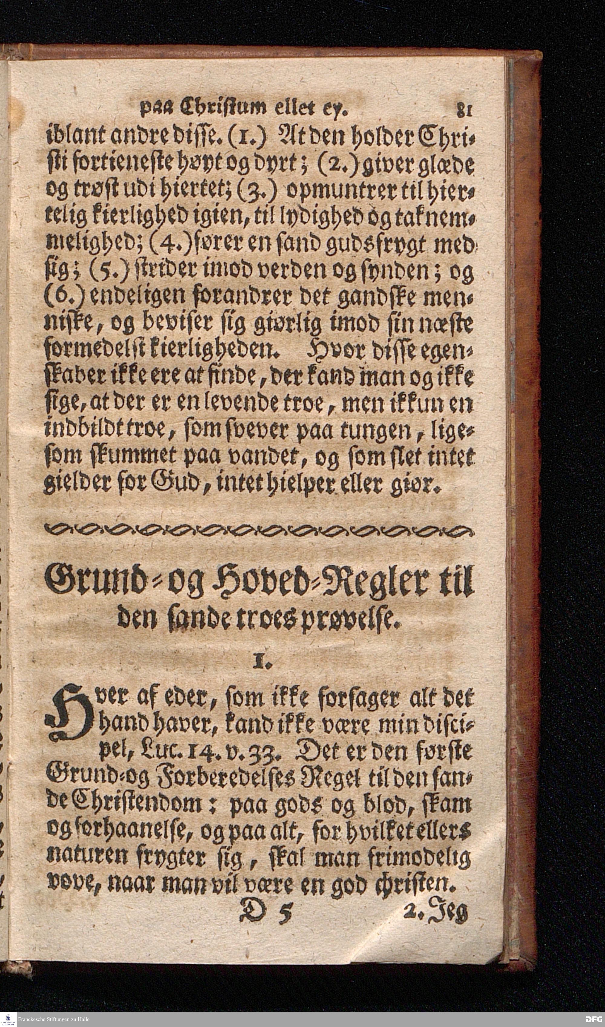 Lærdom Om Et christeligt Levnets Begyndelse, Som indeholder fire Deele: 1. En grundig Anviisning til sand bod og troe paa Gud. 2. En enfoldig Underviisning, hvorledes man skal læse den hellige Skrift til sin rette opbyggelse. 3. En Underviisning af Skriften til at bede ret og Gud behageligen. 4. En kort Prøve, om man har den sande levende troe til Christum, eller ey. KJØBENHAVN,Trykt udi Missions Collegii Bogtrykkerie og paa dets forlag. Aar 1725