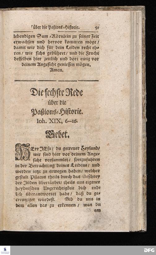 August Hermann Franckens / S.Theol.Prof.& Past.zu S.Ulrich und des Gymnasii Scholarchæ, Oeffentliche Reden über die Paßions=Historie / Wie dieselbe vom Evangelisten Johanne im 18.u.19. Cap. beschrieben ist / gehalten Von Esto mihi bis Ostern 1716. In dem Wäysenhause zu Glaucha an Halle. EDITIO II. HALLE / Gedruckt und verlegt im Wäysenhause MDCCXIX.