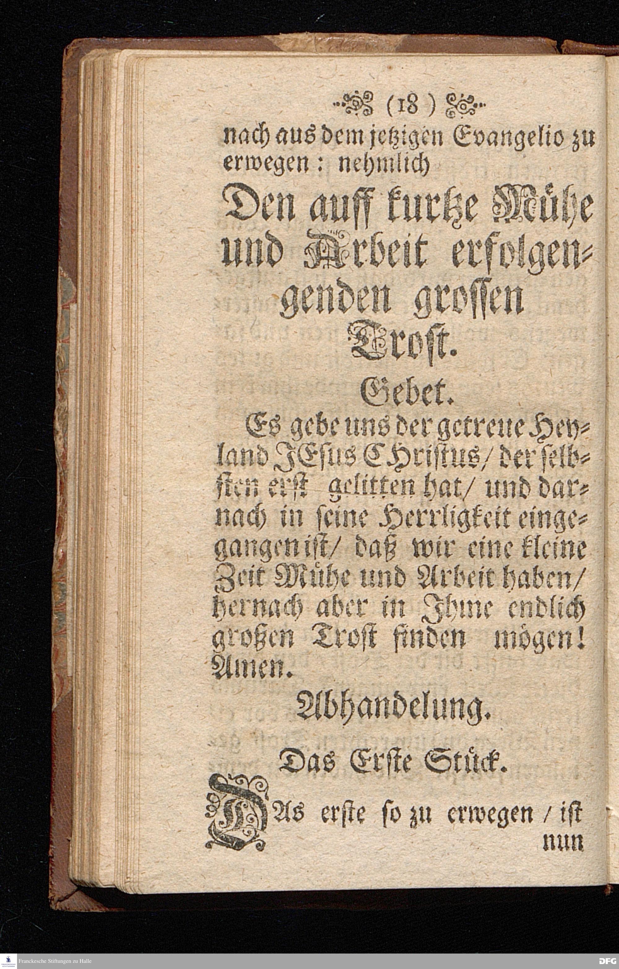 Der Auff kurtze Mühe und Arbeit erfolgende grosse Trost / In einer Predigt Uber das Evangelium Joh.XVI, vers.16==23, Am Sontag JUBILATE Anno 1697. In der St.Georgen=Kirche zu Glaucha an Halle vorgestellet von M.August Hermann Francken / Gr.& OO.LL.P.P.& P.Glauch. HALLE / Druckts Christian Henckel / Univers.Buchdr. J.J.C. 1698.