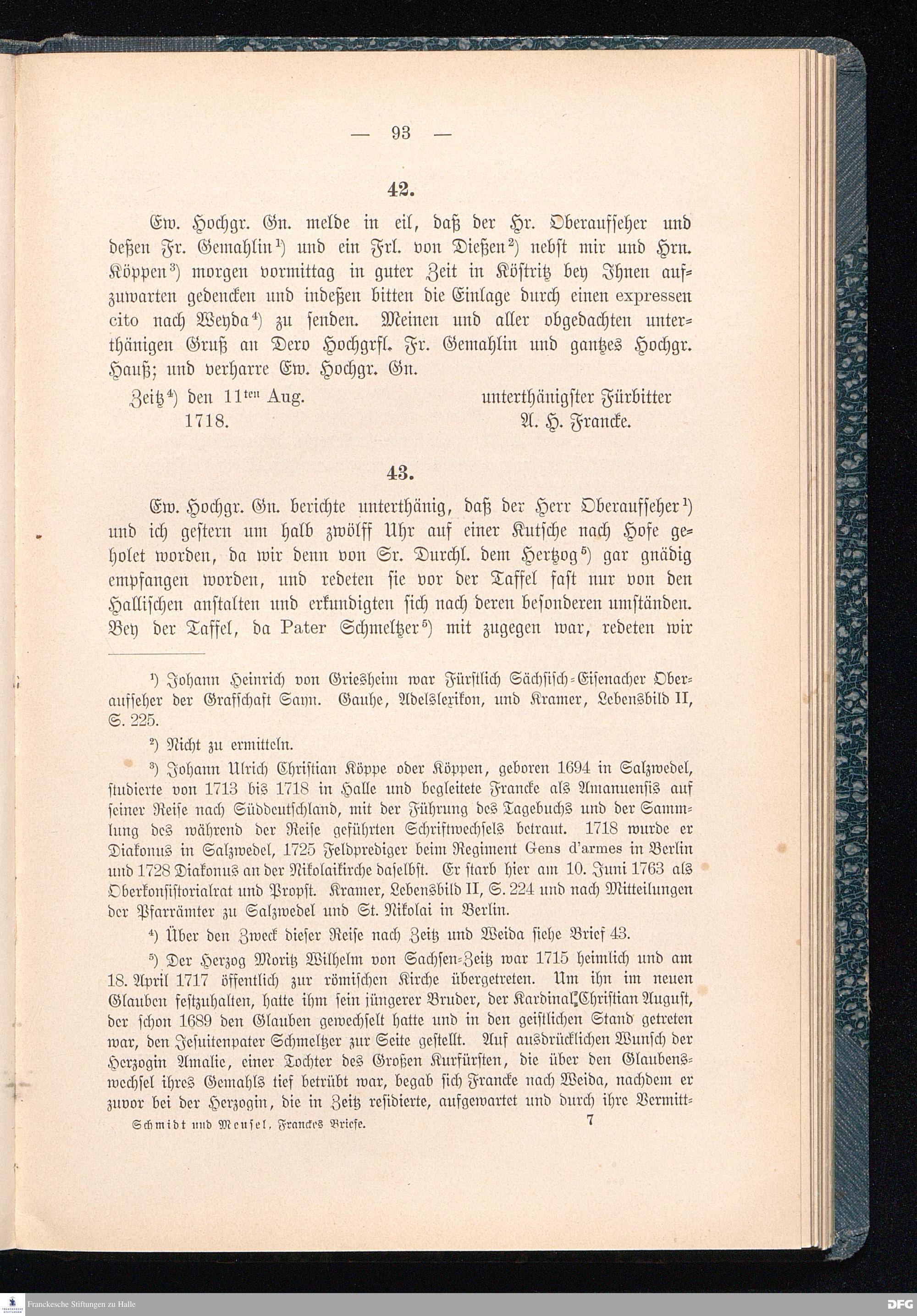 A.H.Franckes Briefe an den Grafen Heinrich XXIV. j.L. Reuß zu Köstritz und seine Gemahlin Eleonore aus den Jahren 1704 bis 1727 als Beitrag zur Geschichte des Pietismus herausgegeben von Dr.Berthold Schmidt Fürstl.Reuß j.L.Archivrat und Lic.theol. Otto Meusel Gymnasialoberlehrer in Schleiz. Leipzig, Verlag der Dürr'schen Buchhandlung 1905.