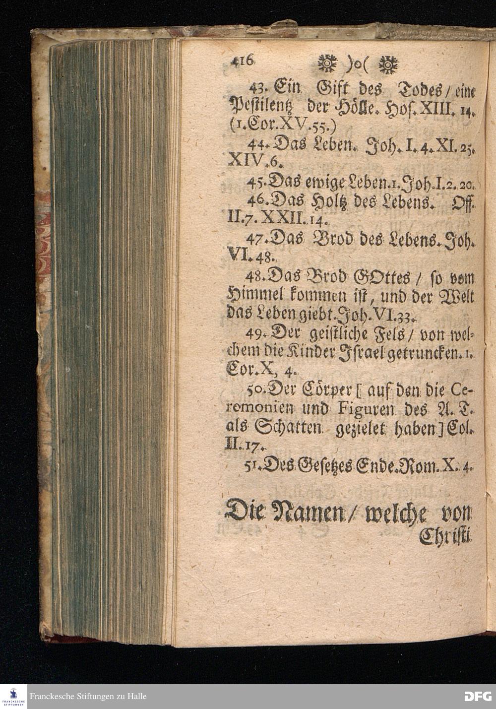 Christus der Kern Heiliger Schrift / Oder Einfältige Anweisung / Wie man CHristum, als den Kern der gantzen H. Schrift, recht suchen, finden, schmäcken, und damit seine Seele nähren, sättigen, und zum ewigen Leben erhalten solle, Worinnen vornemlich der Anfang des Evangelii Johannis durch neun unterschiedene Betrachtungen erläutert, und die wahre wesentliche GOttheit unsers HErrn JEsu CHristi mit klaren Gründen erwiesen wird von August Hermann Francken / S.Th.Pr.& Past.zu S.Ulrich, und des Gymn.Sch. Andere Auflage. HALLE, In Verlegung des Wäysenhauses. MDCCXVI.