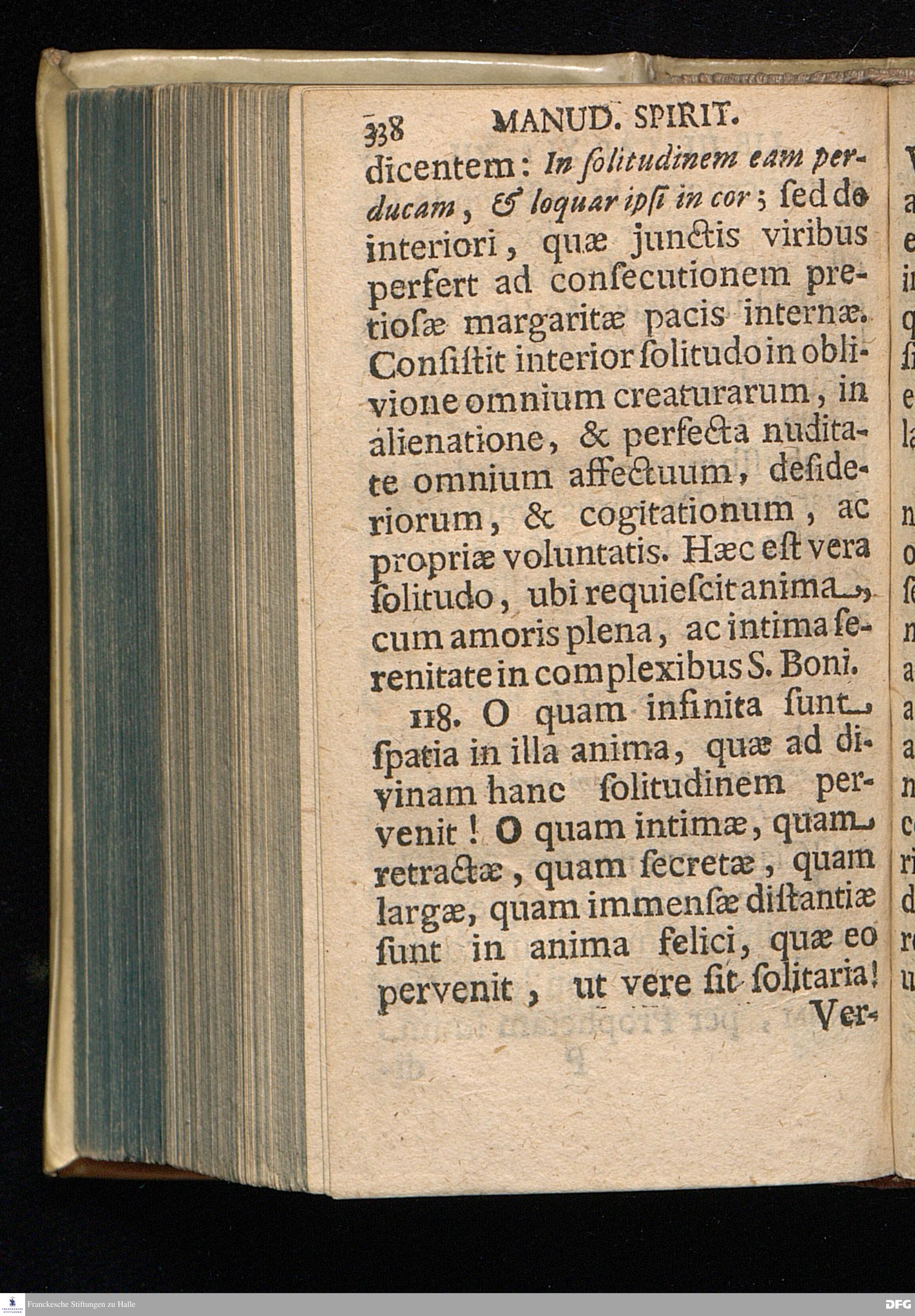 D.MICHAELIS DE MOLINOS, SACERDOTIS, MANUDUCTIO SPIRITUALIS, Extricans animam, eamque perviam interiorem ad acquirendam contemplationis perfectionem, acdivitem pacis interioris thesaurum deducens una cum TRACTATU EJUSDEM De QUOTIDIANA COMMUNIONE, Fideliter & stylo Mysticorum conformiter in latinam lingvam translata A M.AUG.HERMANNO FRANCKIO. Liber, in quo præcipua Eorum, qui vulgo QUIETISTÆ vocantur, DOGMATA declarantur. LIPSIÆ, Sumpt.REINHARDI WÆCHTLER, hactenus Arg.nunc Lips.Bibliopol. MDCLXXXVII.