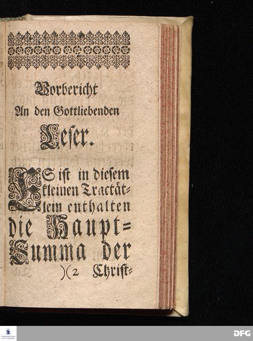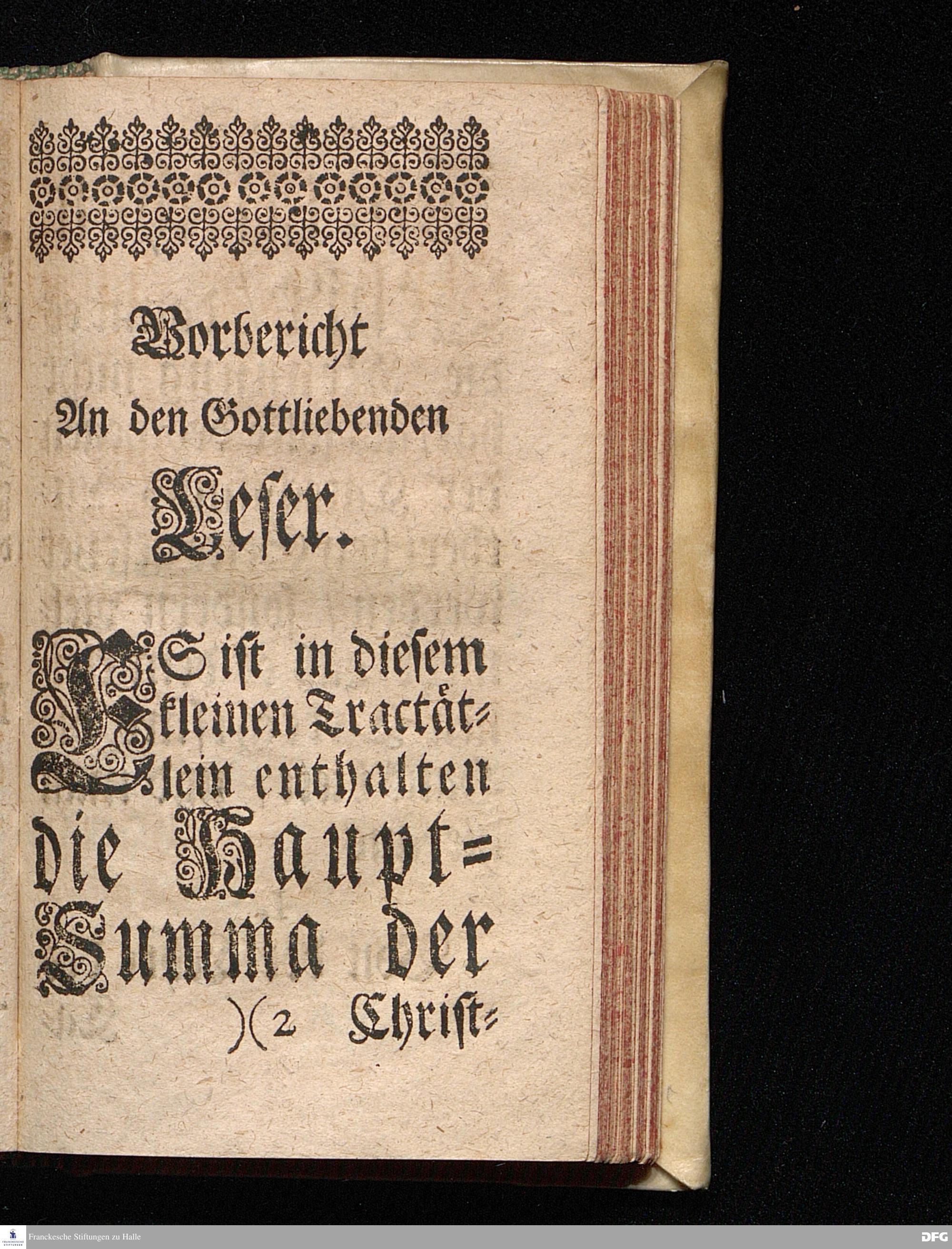 Die Haupt=Summa Der Christlichen Lehre / Zu einem kurtzen / iedoch deutlichen / gründlichen und ordentlichen Begriff aller Glaubens=Artickel in Frage und Antwort verfasset von M.Johan.Hieronymo Wiegeleben / Subconrectore zu Gotha. Nebst Einem Vorbericht M.Aug.Hermann Franckens / Gr.& OO.LL.P.P.& Past. HALLE / Zu finden bey Joh.Jacob Schützen.