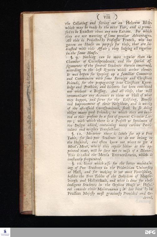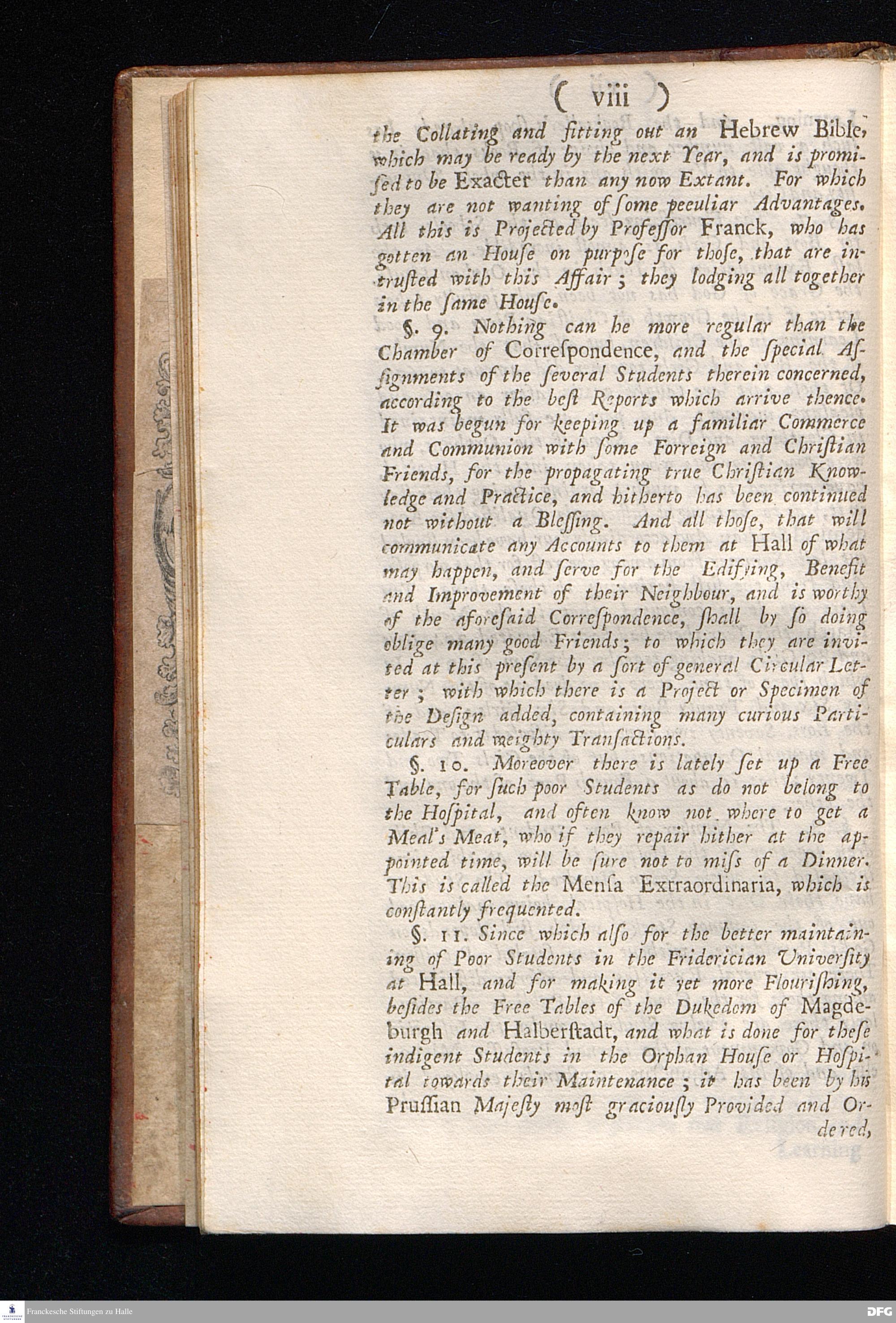 Pietas Hallensis: Being an Historical Narration Of the wonderful FOOT-STEPS OF Divine Providence In Erecting, Carrying on, and Building the Orphan-House, And other charitable Institutions, at Glaucha near Hall in Saxony, Without any visible FUND to support it. By Augustus Hermannus Franck; Professor of Divinity in the Frederician University of Hall, Pastor of Glaucha, and Director of the Pious Foundations there. Continued to the beginning of the Year MDCCII, In a Letter to a Friend. And an APPENDIX giving a more clear and full View of the Progress of Learning and Christian Piety, both in the said University, and in the Royal Collegiate Schools. To which is added Several Considerable Papers relating to this WORK, Written by the King of PRUSSIA. LONDON, Printed by Joseph Downing, for R. Burrough at the Sun and Moon in Cornhill, near the Royal Exchange, 1705