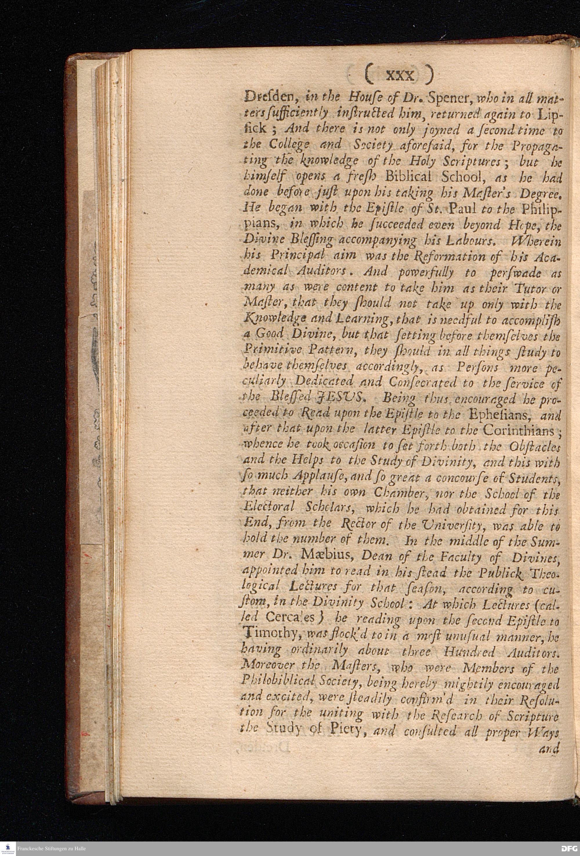 Pietas Hallensis: Being an Historical Narration Of the wonderful FOOT-STEPS OF Divine Providence In Erecting, Carrying on, and Building the Orphan-House, And other charitable Institutions, at Glaucha near Hall in Saxony, Without any visible FUND to support it. By Augustus Hermannus Franck; Professor of Divinity in the Frederician University of Hall, Pastor of Glaucha, and Director of the Pious Foundations there. Continued to the beginning of the Year MDCCII, In a Letter to a Friend. And an APPENDIX giving a more clear and full View of the Progress of Learning and Christian Piety, both in the said University, and in the Royal Collegiate Schools. To which is added Several Considerable Papers relating to this WORK, Written by the King of PRUSSIA. LONDON, Printed by Joseph Downing, for R. Burrough at the Sun and Moon in Cornhill, near the Royal Exchange, 1705