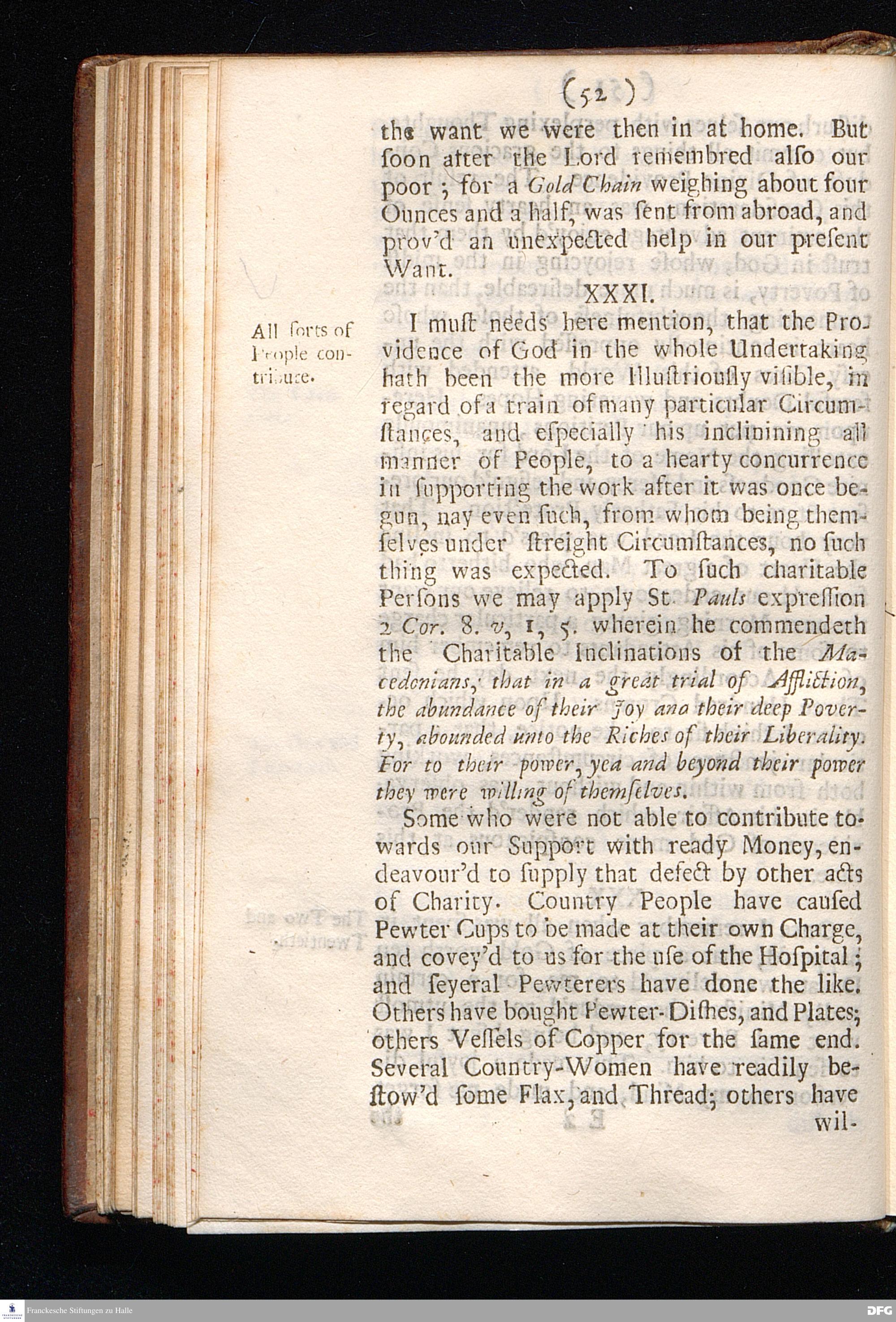 Pietas Hallensis: Being an Historical Narration Of the wonderful FOOT-STEPS OF Divine Providence In Erecting, Carrying on, and Building the Orphan-House, And other charitable Institutions, at Glaucha near Hall in Saxony, Without any visible FUND to support it. By Augustus Hermannus Franck; Professor of Divinity in the Frederician University of Hall, Pastor of Glaucha, and Director of the Pious Foundations there. Continued to the beginning of the Year MDCCII, In a Letter to a Friend. And an APPENDIX giving a more clear and full View of the Progress of Learning and Christian Piety, both in the said University, and in the Royal Collegiate Schools. To which is added Several Considerable Papers relating to this WORK, Written by the King of PRUSSIA. LONDON, Printed by Joseph Downing, for R. Burrough at the Sun and Moon in Cornhill, near the Royal Exchange, 1705
