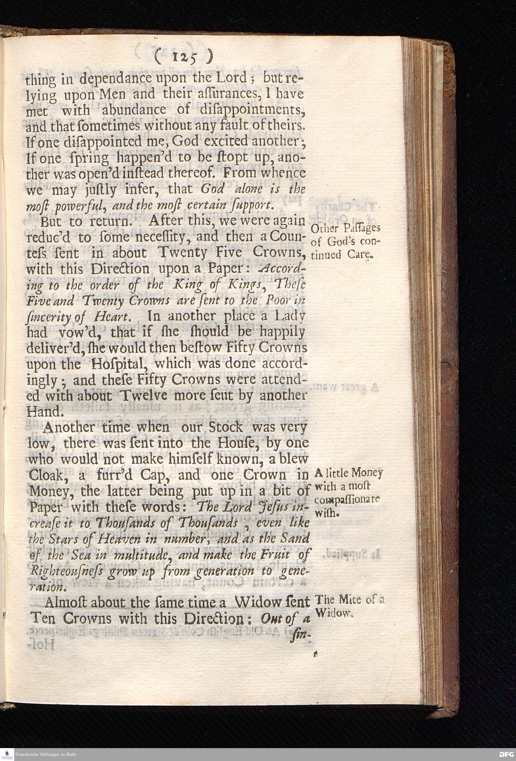 Pietas Hallensis: Being an Historical Narration Of the wonderful FOOT-STEPS OF Divine Providence In Erecting, Carrying on, and Building the Orphan-House, And other charitable Institutions, at Glaucha near Hall in Saxony, Without any visible FUND to support it. By Augustus Hermannus Franck; Professor of Divinity in the Frederician University of Hall, Pastor of Glaucha, and Director of the Pious Foundations there. Continued to the beginning of the Year MDCCII, In a Letter to a Friend. And an APPENDIX giving a more clear and full View of the Progress of Learning and Christian Piety, both in the said University, and in the Royal Collegiate Schools. To which is added Several Considerable Papers relating to this WORK, Written by the King of PRUSSIA. LONDON, Printed by Joseph Downing, for R. Burrough at the Sun and Moon in Cornhill, near the Royal Exchange, 1705