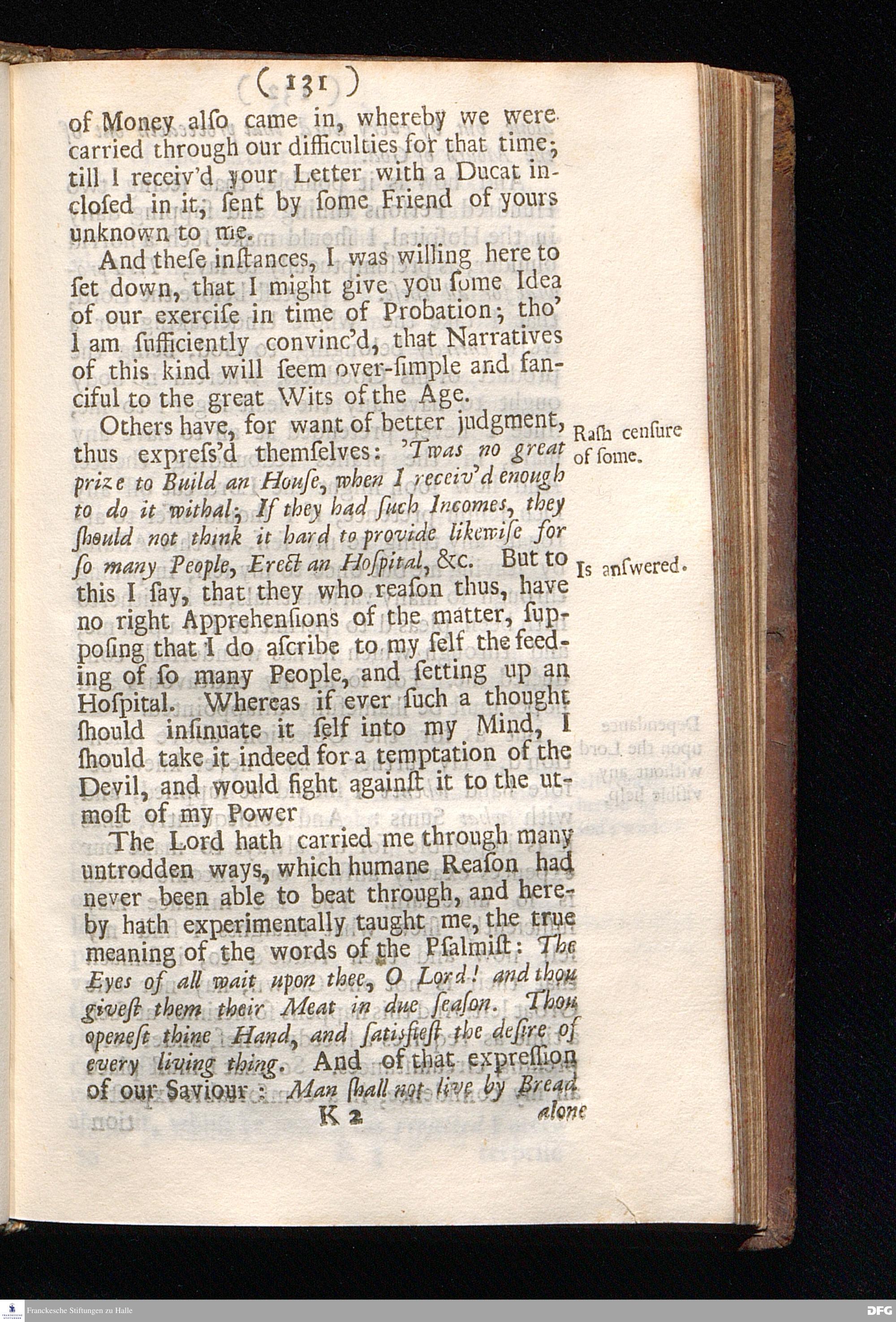 Pietas Hallensis: Being an Historical Narration Of the wonderful FOOT-STEPS OF Divine Providence In Erecting, Carrying on, and Building the Orphan-House, And other charitable Institutions, at Glaucha near Hall in Saxony, Without any visible FUND to support it. By Augustus Hermannus Franck; Professor of Divinity in the Frederician University of Hall, Pastor of Glaucha, and Director of the Pious Foundations there. Continued to the beginning of the Year MDCCII, In a Letter to a Friend. And an APPENDIX giving a more clear and full View of the Progress of Learning and Christian Piety, both in the said University, and in the Royal Collegiate Schools. To which is added Several Considerable Papers relating to this WORK, Written by the King of PRUSSIA. LONDON, Printed by Joseph Downing, for R. Burrough at the Sun and Moon in Cornhill, near the Royal Exchange, 1705