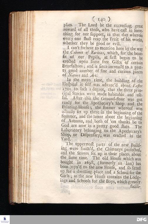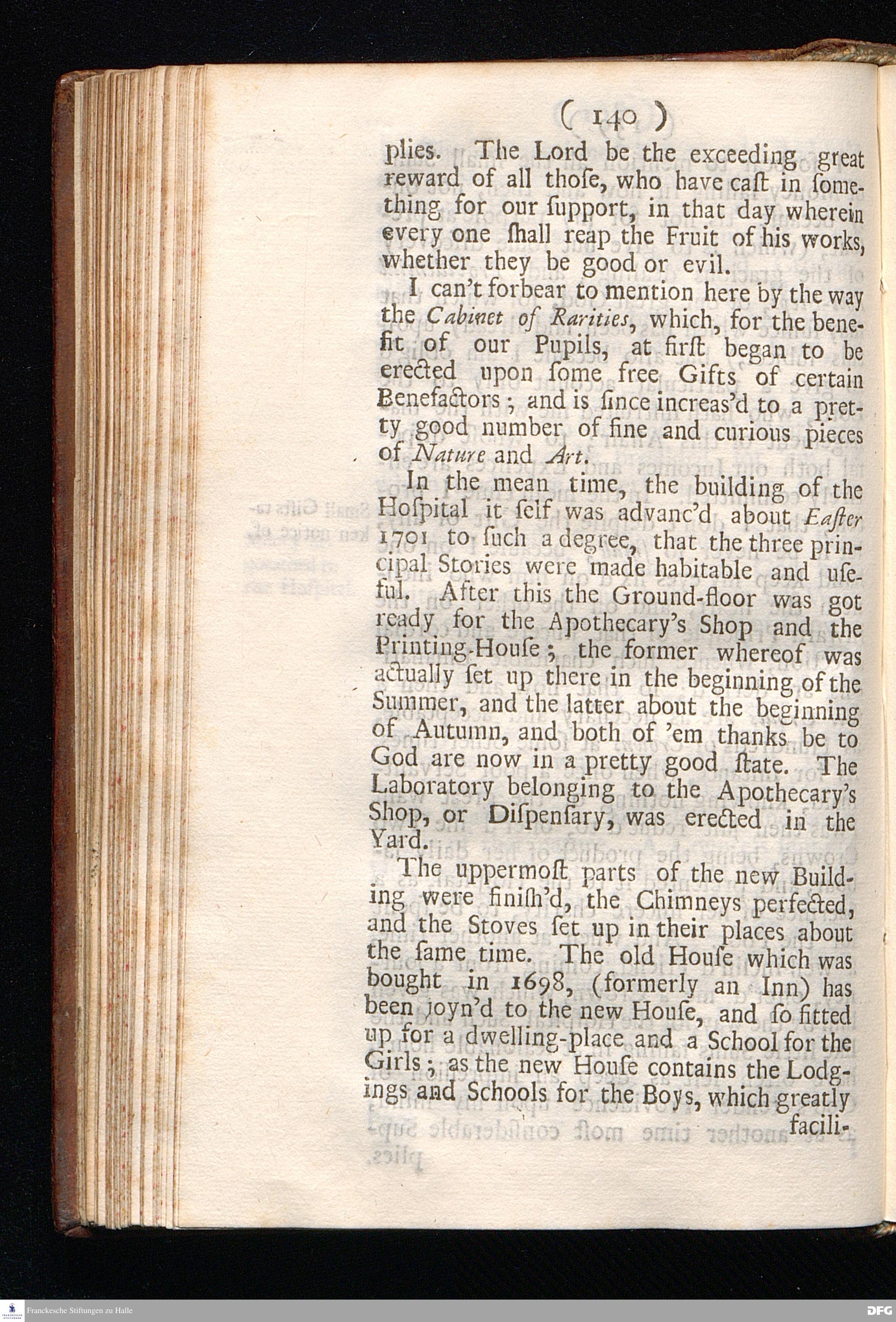Pietas Hallensis: Being an Historical Narration Of the wonderful FOOT-STEPS OF Divine Providence In Erecting, Carrying on, and Building the Orphan-House, And other charitable Institutions, at Glaucha near Hall in Saxony, Without any visible FUND to support it. By Augustus Hermannus Franck; Professor of Divinity in the Frederician University of Hall, Pastor of Glaucha, and Director of the Pious Foundations there. Continued to the beginning of the Year MDCCII, In a Letter to a Friend. And an APPENDIX giving a more clear and full View of the Progress of Learning and Christian Piety, both in the said University, and in the Royal Collegiate Schools. To which is added Several Considerable Papers relating to this WORK, Written by the King of PRUSSIA. LONDON, Printed by Joseph Downing, for R. Burrough at the Sun and Moon in Cornhill, near the Royal Exchange, 1705