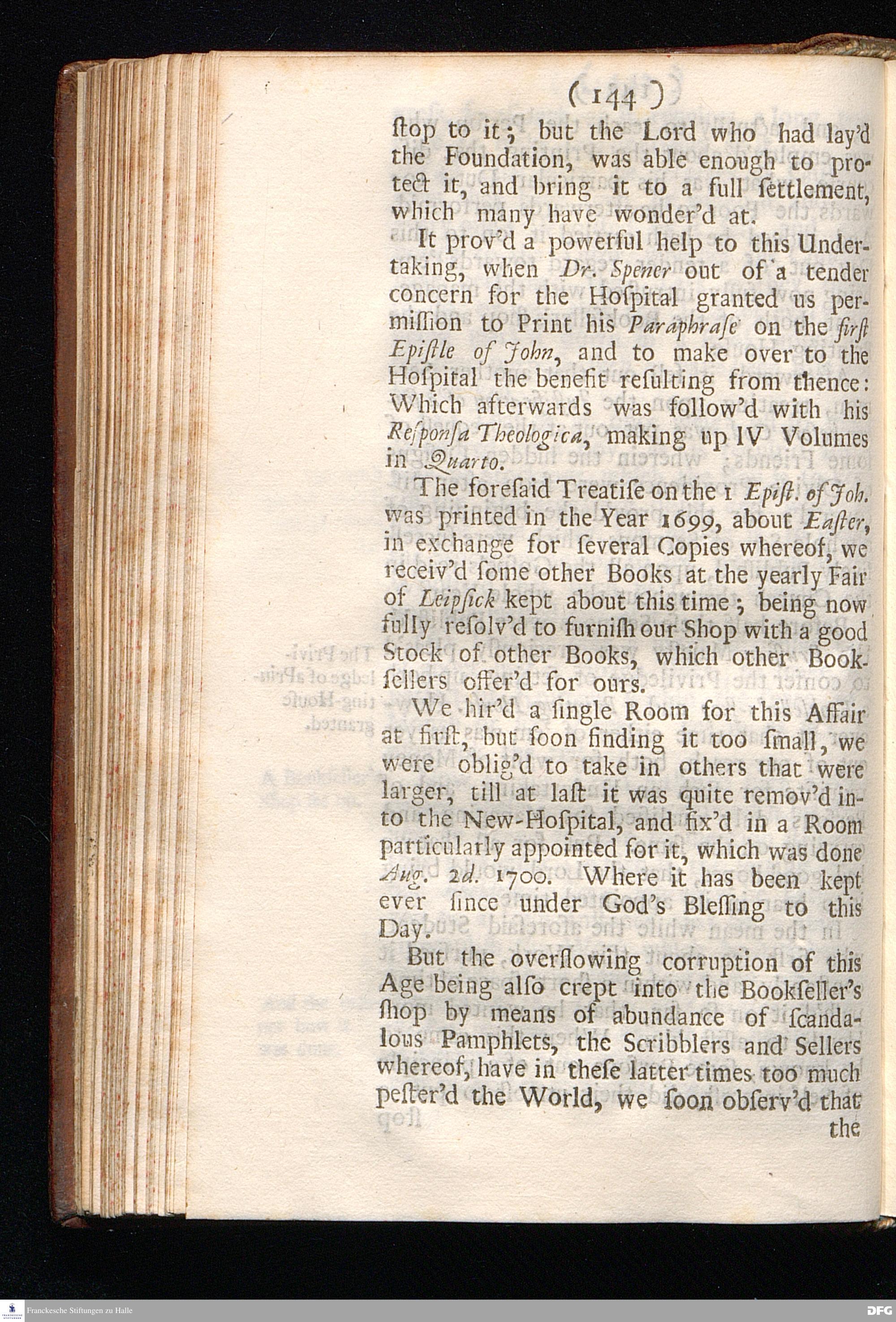 Pietas Hallensis: Being an Historical Narration Of the wonderful FOOT-STEPS OF Divine Providence In Erecting, Carrying on, and Building the Orphan-House, And other charitable Institutions, at Glaucha near Hall in Saxony, Without any visible FUND to support it. By Augustus Hermannus Franck; Professor of Divinity in the Frederician University of Hall, Pastor of Glaucha, and Director of the Pious Foundations there. Continued to the beginning of the Year MDCCII, In a Letter to a Friend. And an APPENDIX giving a more clear and full View of the Progress of Learning and Christian Piety, both in the said University, and in the Royal Collegiate Schools. To which is added Several Considerable Papers relating to this WORK, Written by the King of PRUSSIA. LONDON, Printed by Joseph Downing, for R. Burrough at the Sun and Moon in Cornhill, near the Royal Exchange, 1705