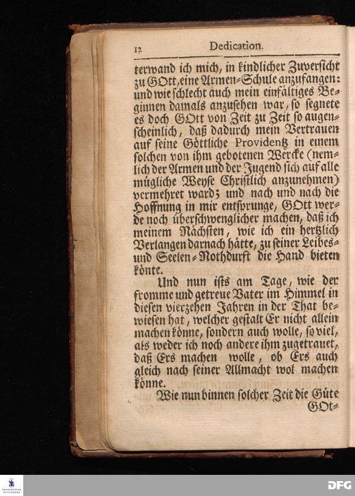 Segens=volle Fußstapfen des noch lebenden und waltenden liebrei=│chen und getreuen GOttes, Zur Beschämung des Unglaubens und Stärckung des Glaubens, entdecket durch eine wahrhafte und umständliche Nachricht von dem Wäysen=Hause und übrigen Anstalten zu Glaucha vor Halle; Welche Im Jahr 1701. zum Druck befördert, ietzo aber zum dritten mal ediret, und bis auf gegenwärtiges Jahr fortgesetzet von August Hermann Francken, S.Theol.Prof.und Past. HALLE, in Verlegung des Wäysen=Hauses, MDCCIX.